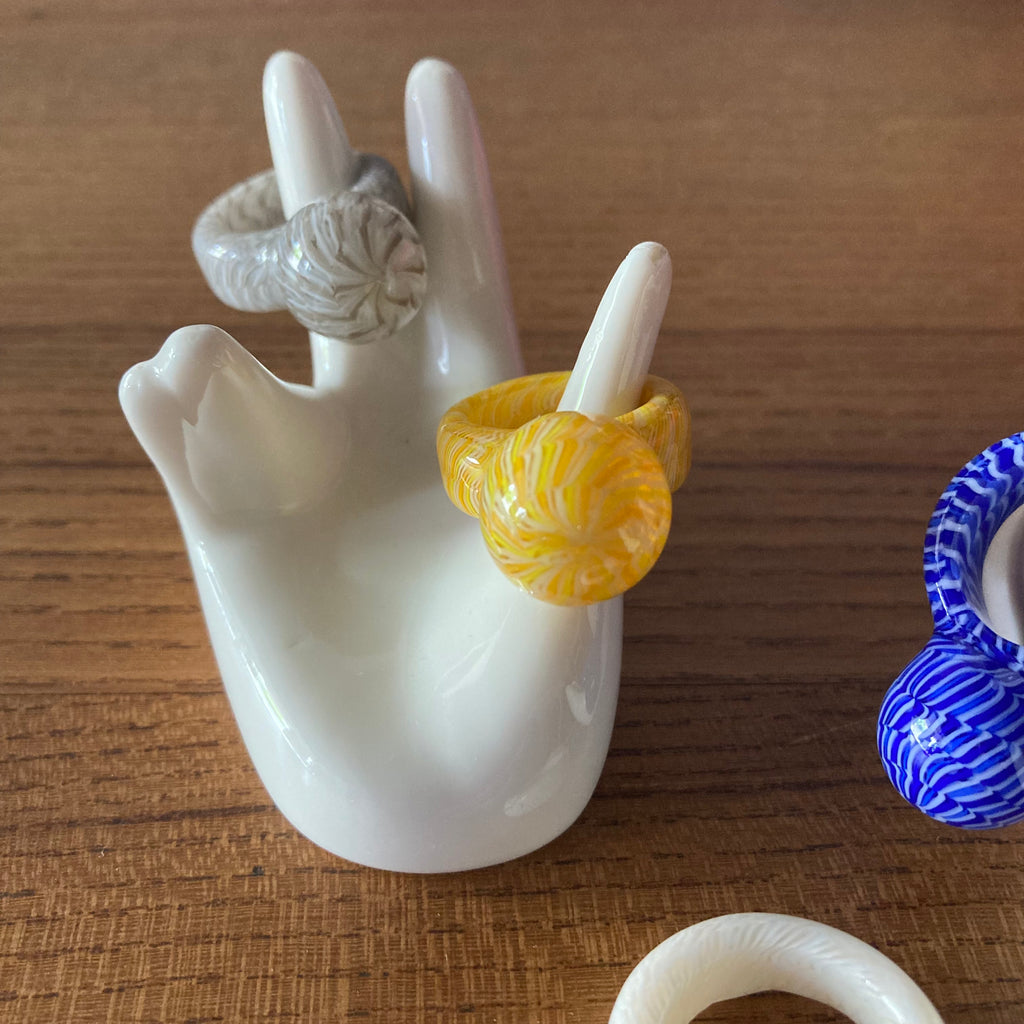 「LULI LAMPWORK(ルリ ランプワーク)」のジュエリーより、ルリリングです。古来からあるとんぼ玉作りの技術によって、全て手作業で作られており、複雑な文様は唯一無二で見入ってしまう美しさ。このリングはガラスが螺旋状に巻かれてとんぼ玉になる軌跡を文様として表現しており、LULI LAMPWORKを象徴するジュエリーです。とんぼ玉作りは1人の職人の手によって、リングの研磨やブレスレットなどの組み立ては2人のデザイナーの手によって行われています。金属アレルギーの方でも問題なく着用でき、程よいボリュームがアクセントになって着こなしを引き締めます。お好きなお色をお選びください。小さな巾着が付属します。再入荷予定あり。