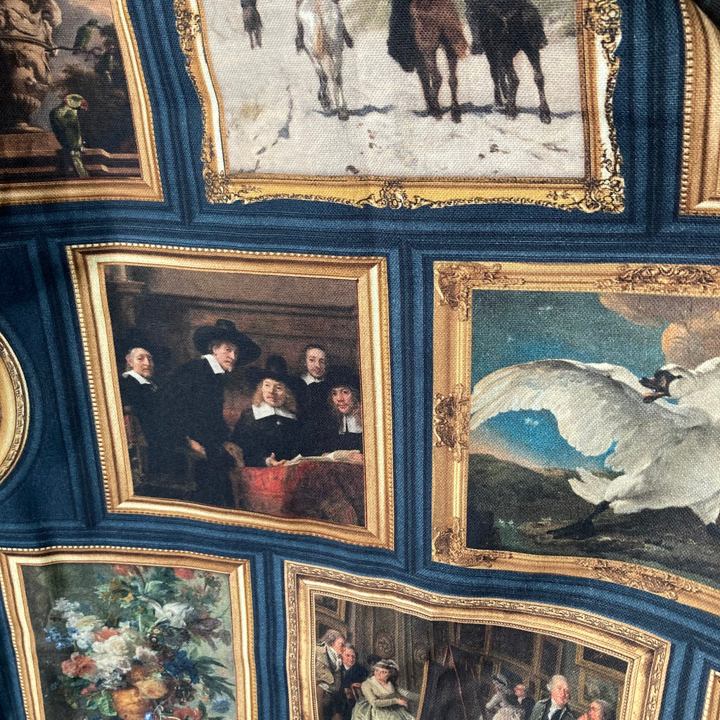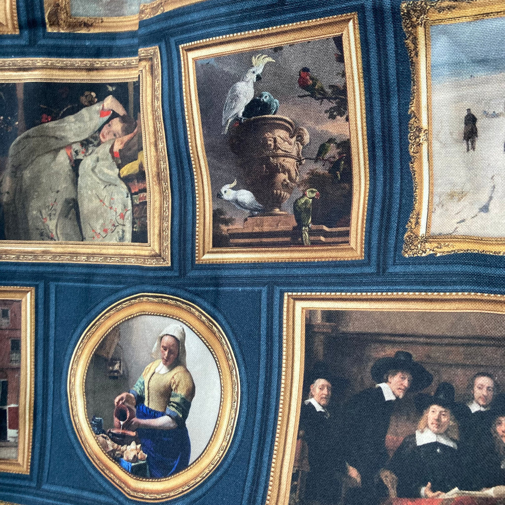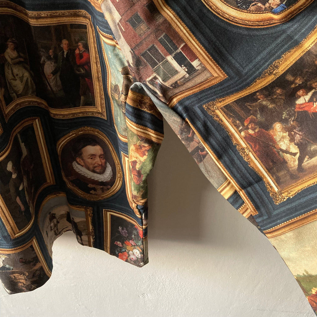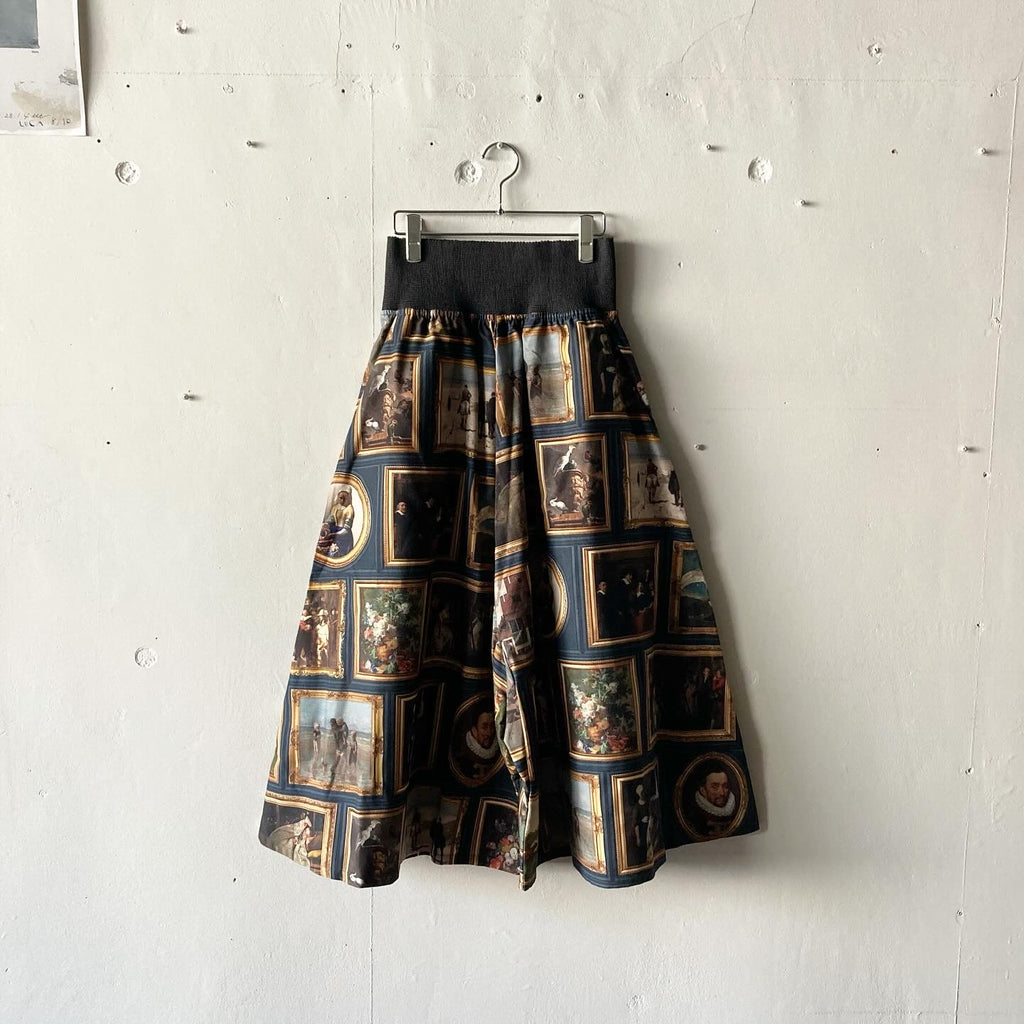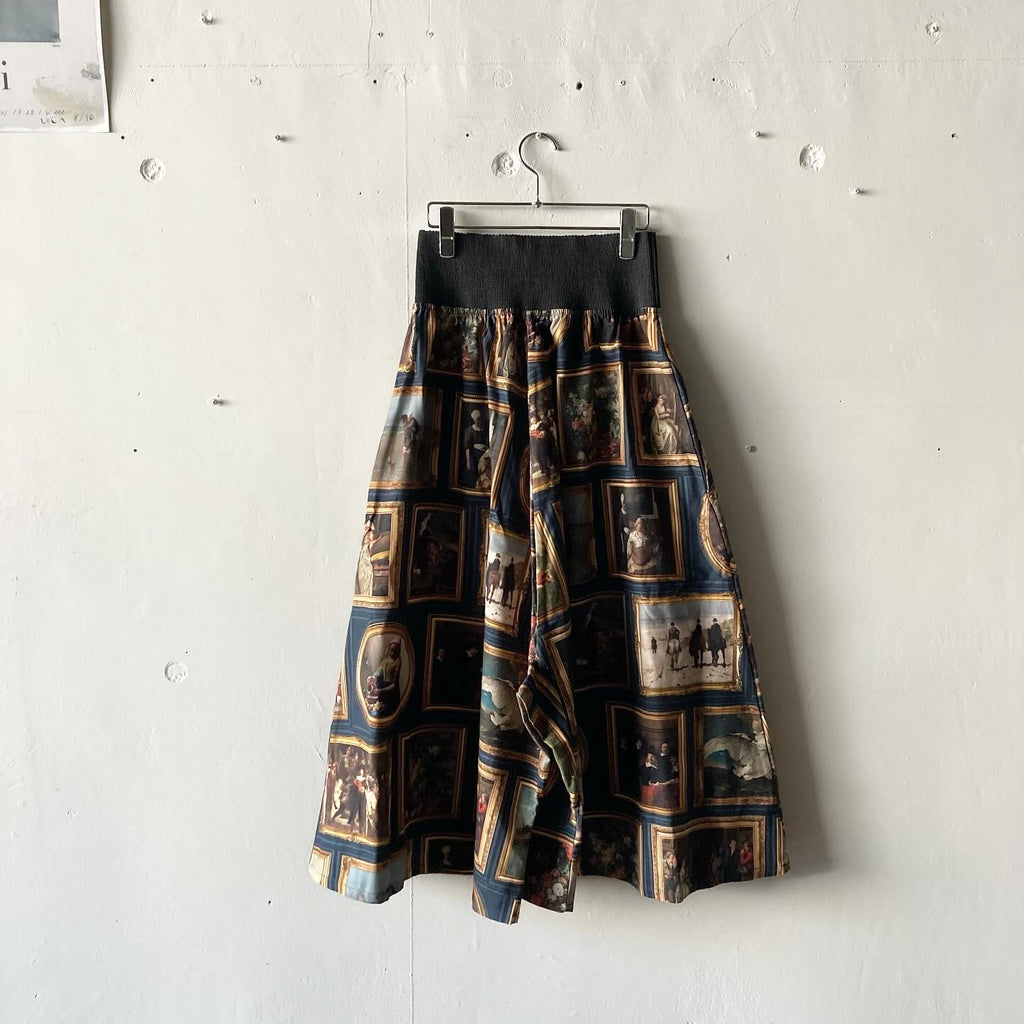 ロングキュロットのようなボリュームのあるシルエットのボトムスで名画がプリントされた生地がかわいいです。(あー知ってる!の絵がいくつありますか?)幅のあるゴム部分はかなりしっかりしていますので、好きな位置でがっちりホールドしてくれます。これから暑さ本番だというのにニットと合わせたらかわいいだろうなぁと思ってしまいました。両サイドポケットあり。フランス製