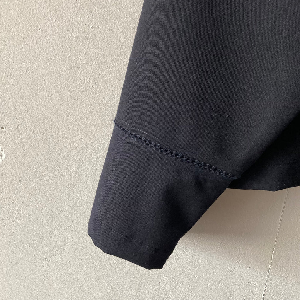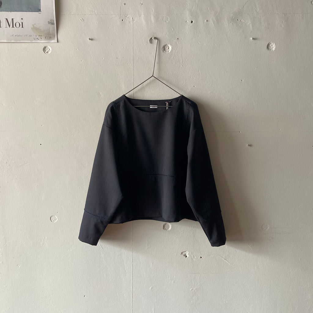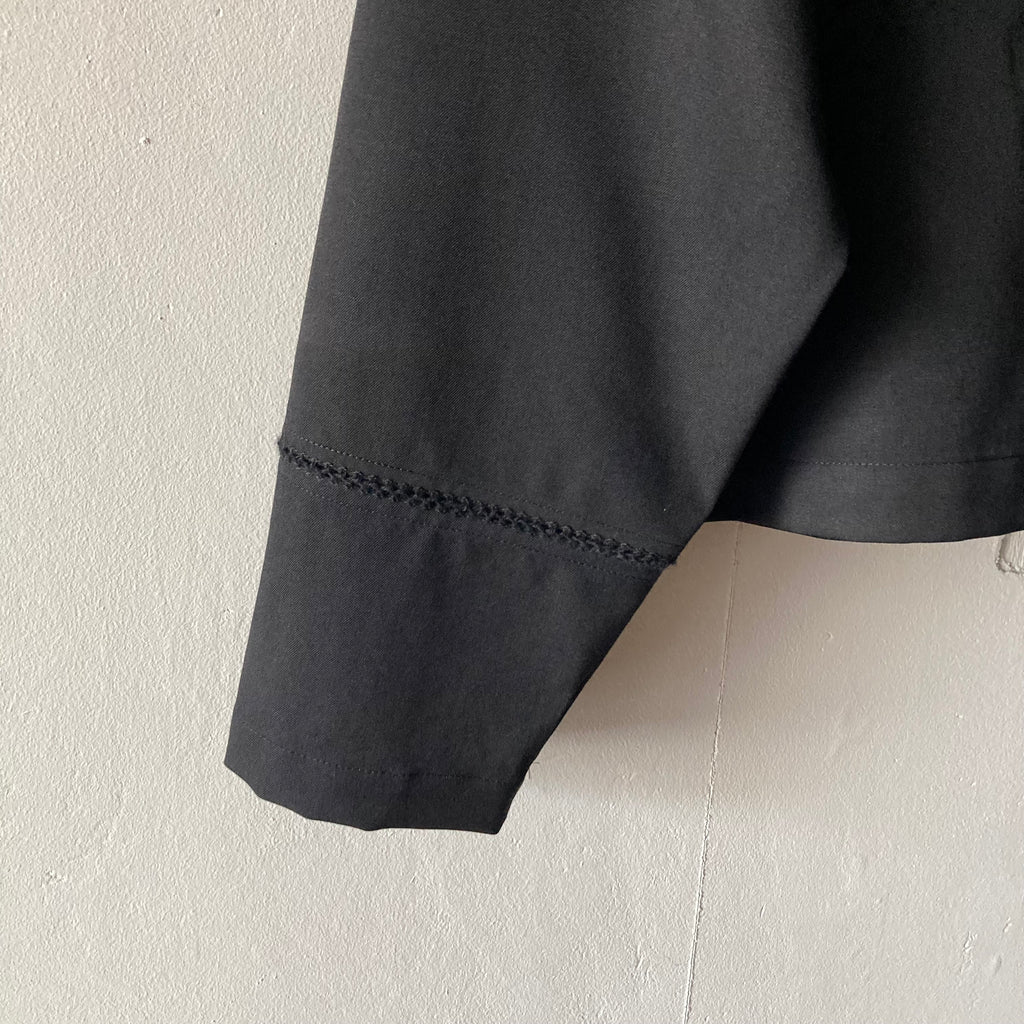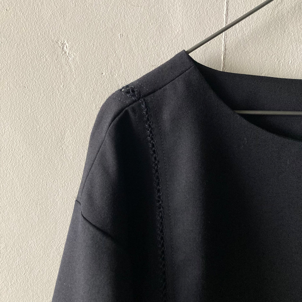 ウールギャバの被りシャツです。袖口と見頃〜背中にかけてぐるりとハシゴレースが施されています。セットアップになる同素材のパンツもございます。このシリーズ、日常のワードローブから冠婚葬祭にもシフトできて、いつ何時も自分らしくいられそうでいいなぁと思いセレクトしました。インナーを少し華やかにしてパールを合わせれば卒・入学式に、控えめなインナーを合わせればセレモニーにも十分使えます。いざという時に慌てないために、普段からお気に入りを探しておきましょう!