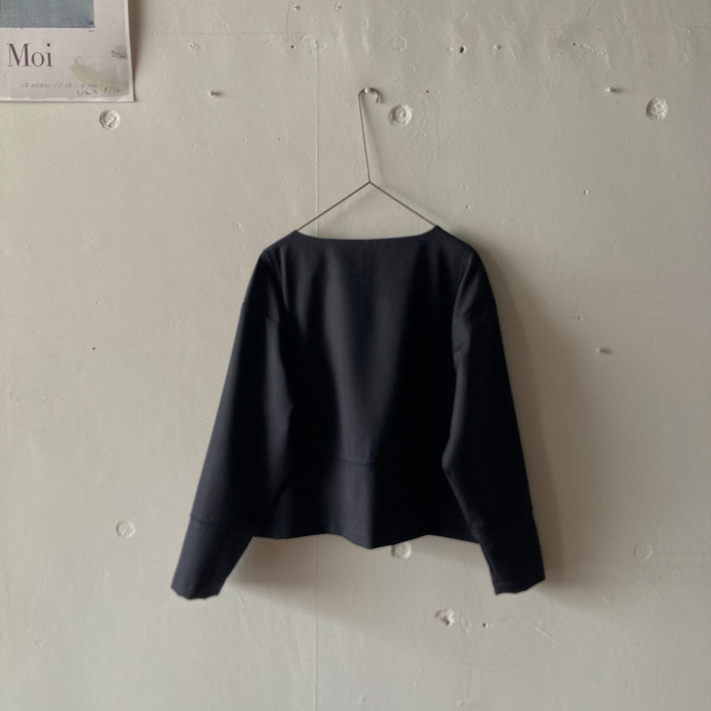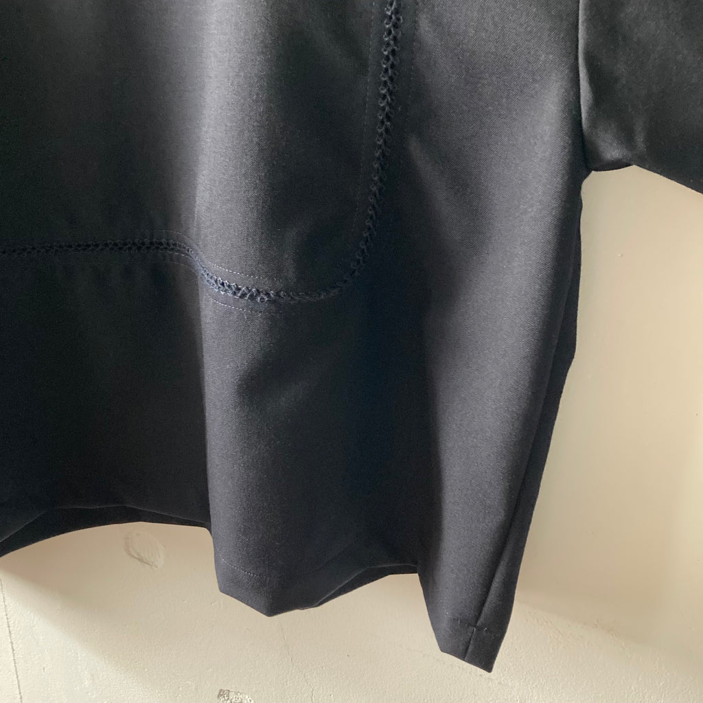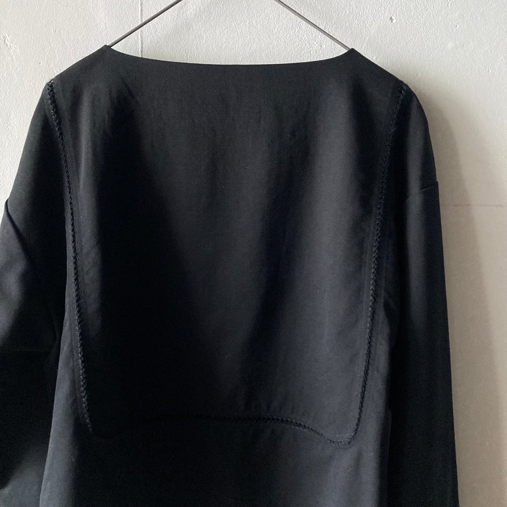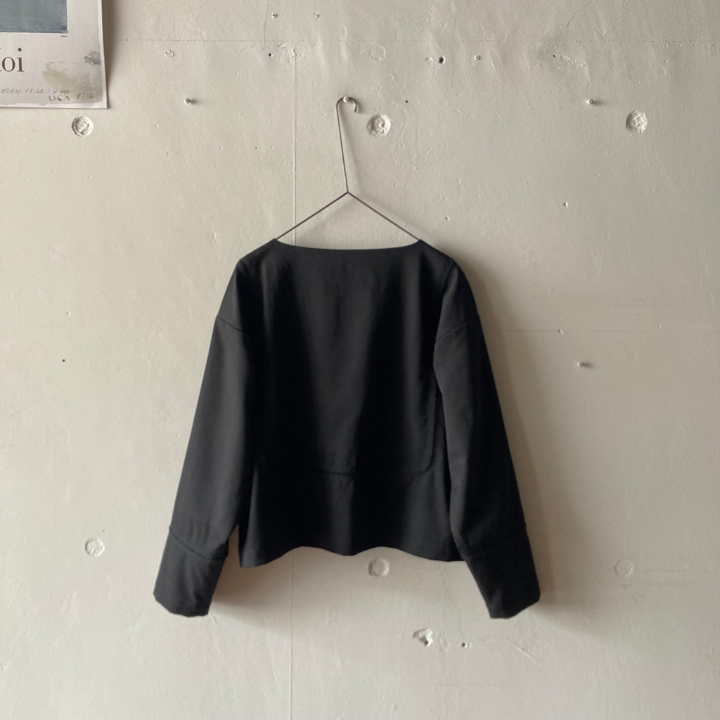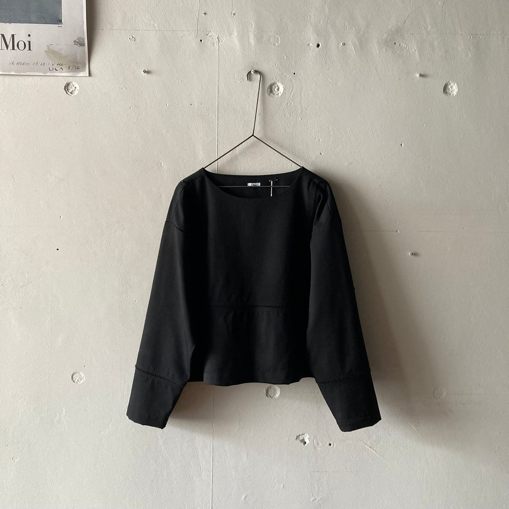 ウールギャバの被りシャツです。袖口と見頃〜背中にかけてぐるりとハシゴレースが施されています。セットアップになる同素材のパンツもございます。このシリーズ、日常のワードローブから冠婚葬祭にもシフトできて、いつ何時も自分らしくいられそうでいいなぁと思いセレクトしました。インナーを少し華やかにしてパールを合わせれば卒・入学式に、控えめなインナーを合わせればセレモニーにも十分使えます。いざという時に慌てないために、普段からお気に入りを探しておきましょう!
