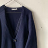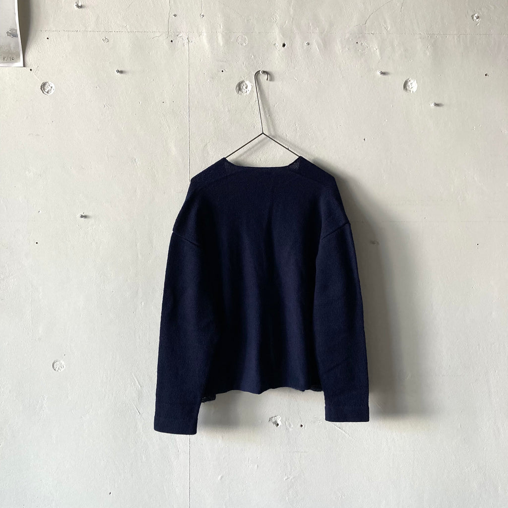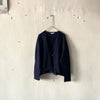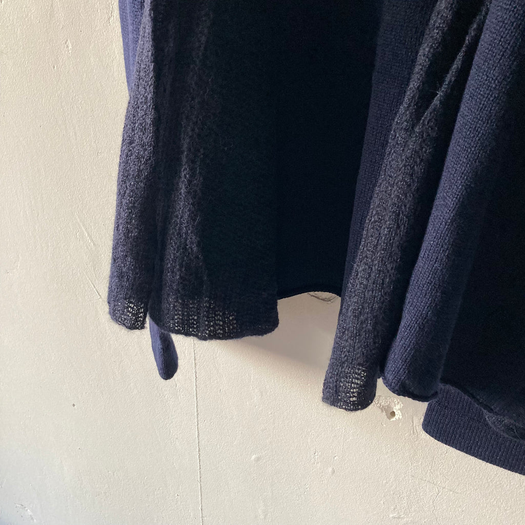 家庭機編みの羽織ものです。前見頃と後ろ見頃はウールカシミヤ、前見頃にのみ軽いレースのような美しい引き上げ柄の編み物が重なっています。後ろ見頃だけ天竺裏目にしていたり(写真では分かりにくいです)ひとつボタンを留める受けの部分もはぎではなく編みで見頃と一体化していたりと細かいところまで作り込まれた手仕事を堪能できる1枚。