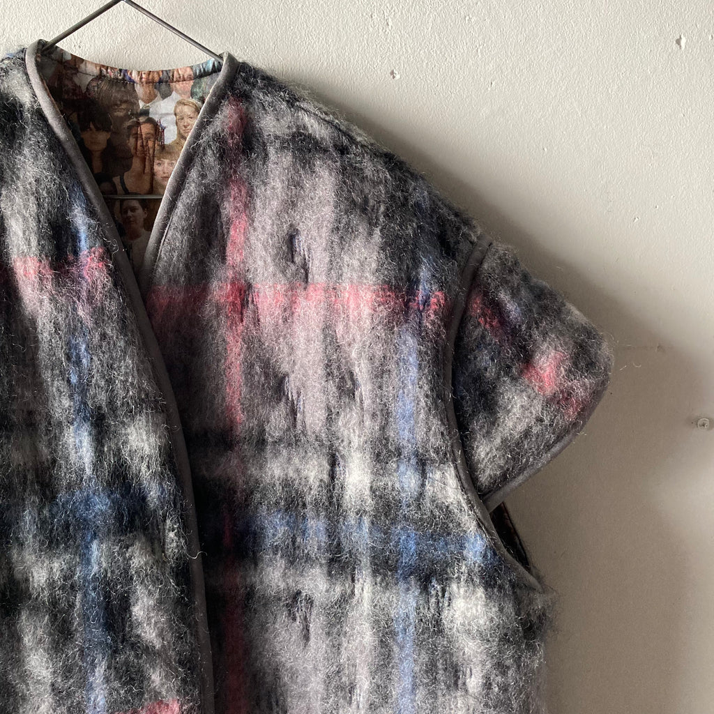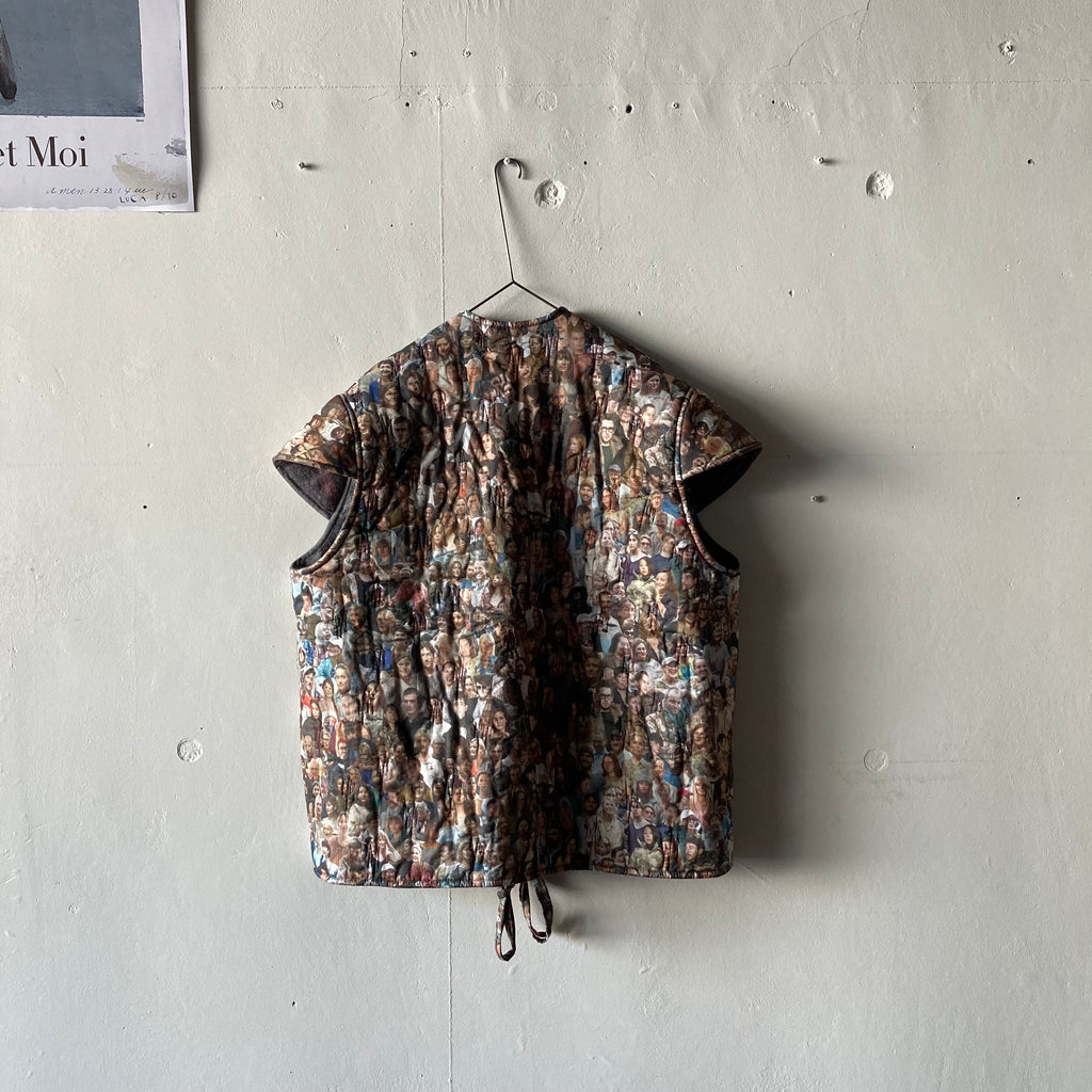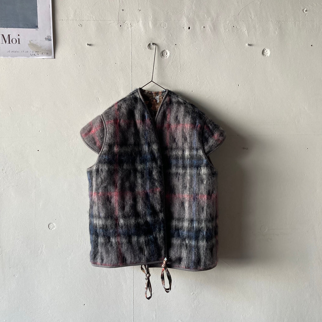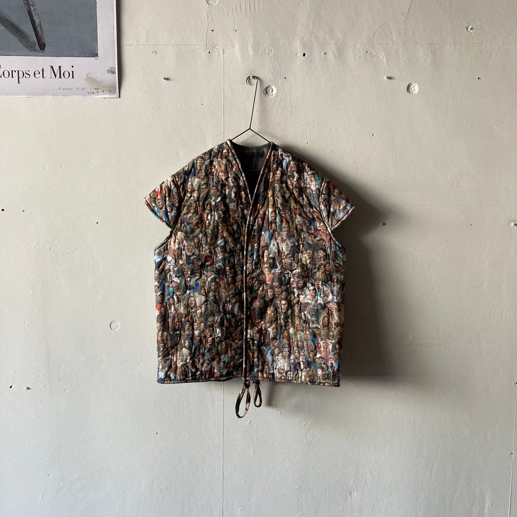 リバーシブルの軽くて暖かなキルティングベストです。表は昨年の夏に行われた25周年ジュビリーの参加者がプリントされたコットン、みんなBLESSを着用しています。裏地はモヘアでピンクとブルーが効いたグレーチェック、表にする面によってがらっと印象が変わるのが面白い。そのままストンと着てもいいですし、付属の紐でギュッとシルエットを絞っても。着ないときはクローゼットにしまい込まずに、ぜひどこかに引っ掛けて眺めてほしい、アートピースのような1着です。厚手のニットの上に羽織るのもおすすめ。男女兼用、フリーサイズ。