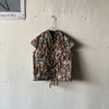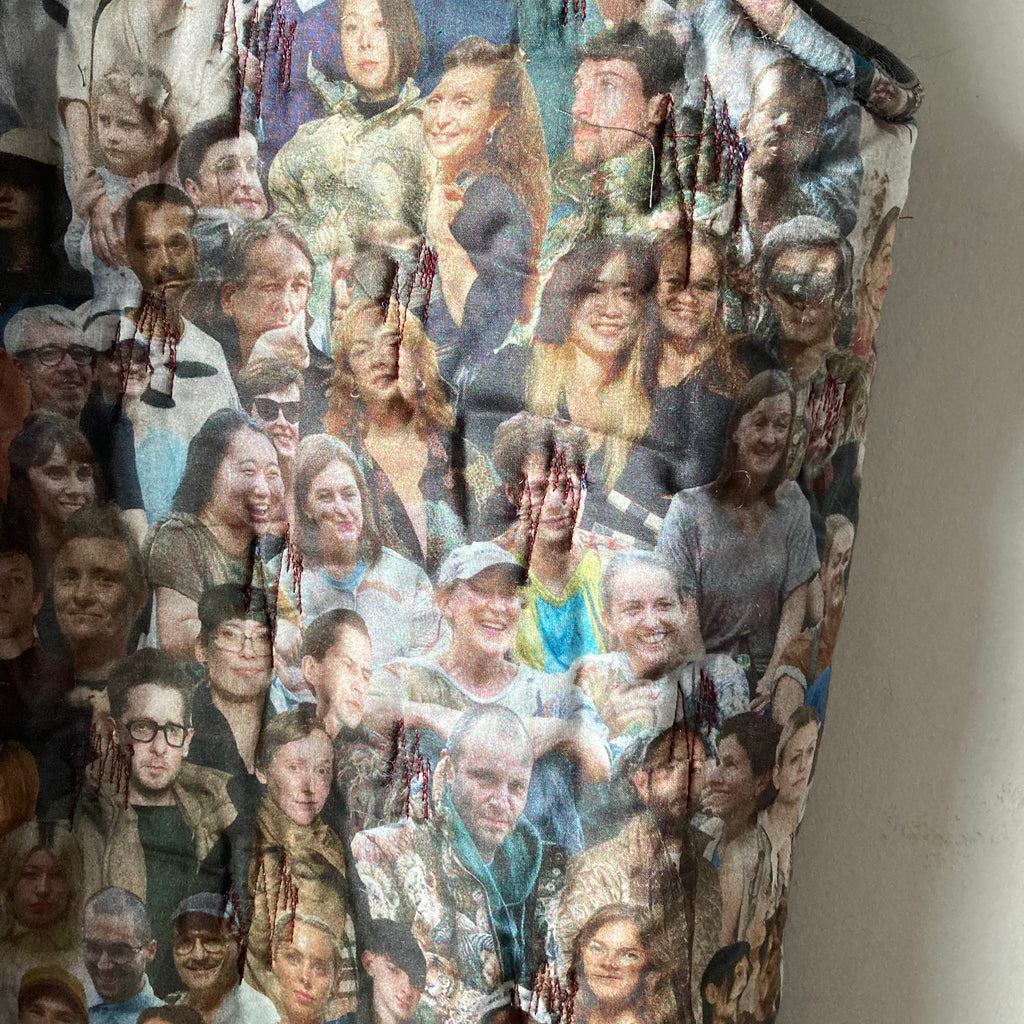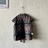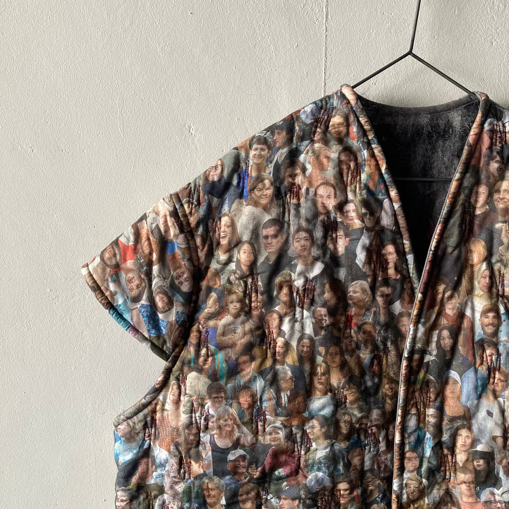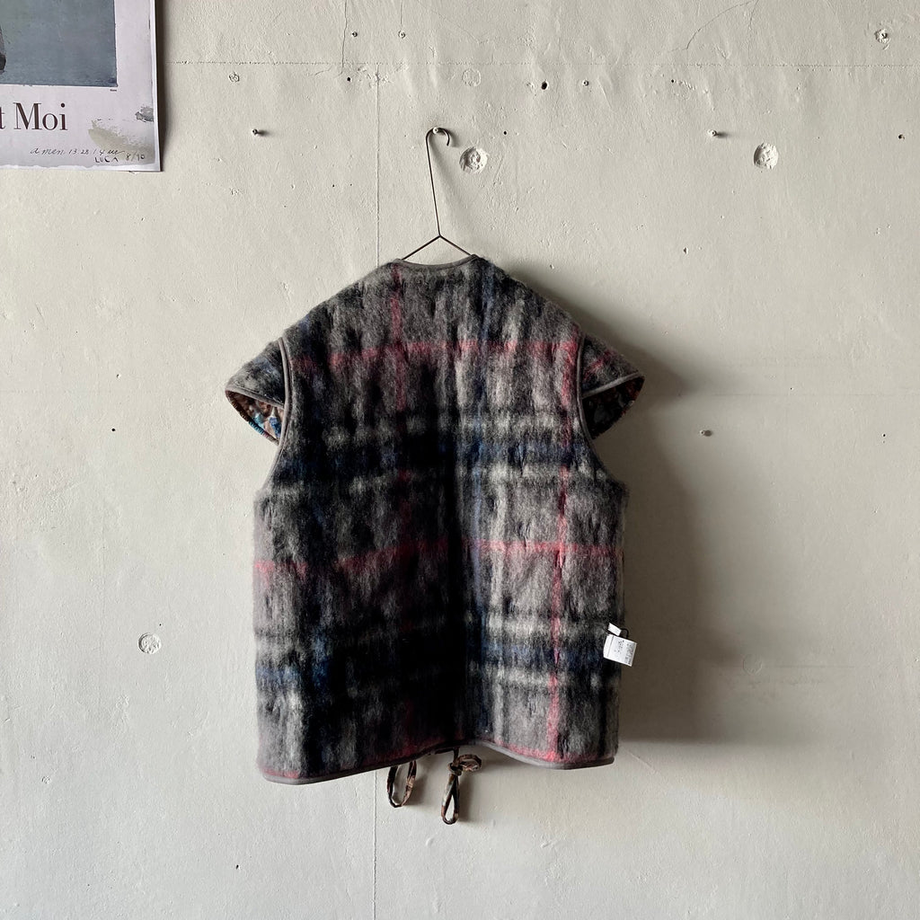 リバーシブルの軽くて暖かなキルティングベストです。表は昨年の夏に行われた25周年ジュビリーの参加者がプリントされたコットン、みんなBLESSを着用しています。裏地はモヘアでピンクとブルーが効いたグレーチェック、表にする面によってがらっと印象が変わるのが面白い。そのままストンと着てもいいですし、付属の紐でギュッとシルエットを絞っても。着ないときはクローゼットにしまい込まずに、ぜひどこかに引っ掛けて眺めてほしい、アートピースのような1着です。厚手のニットの上に羽織るのもおすすめ。男女兼用、フリーサイズ。