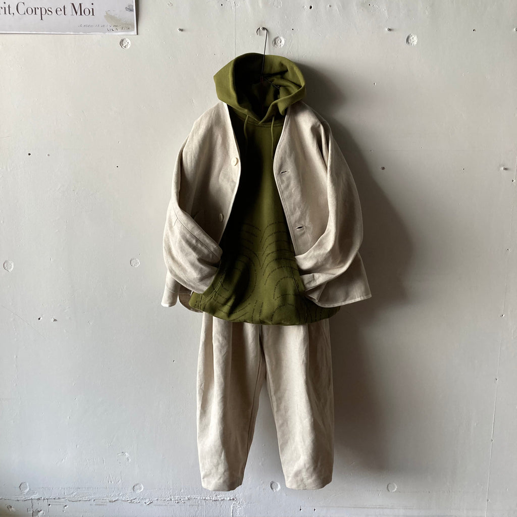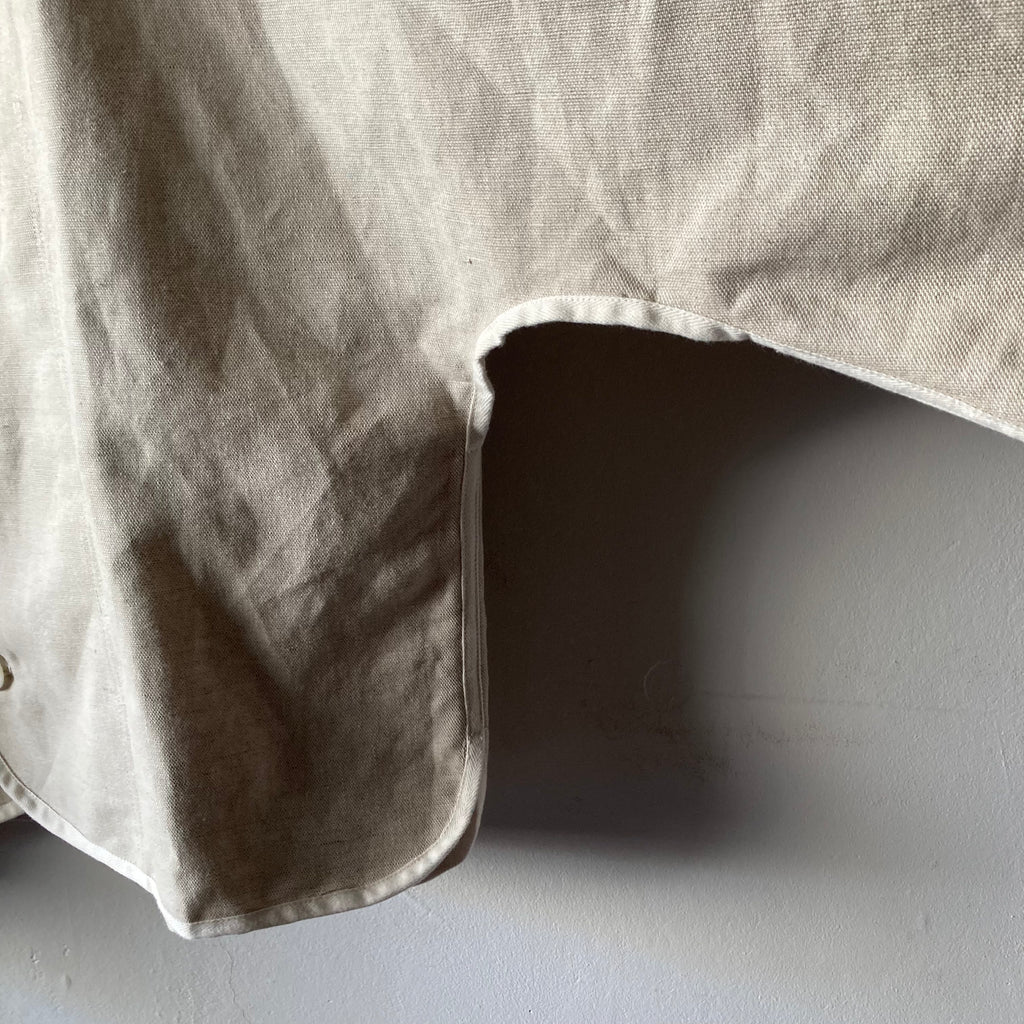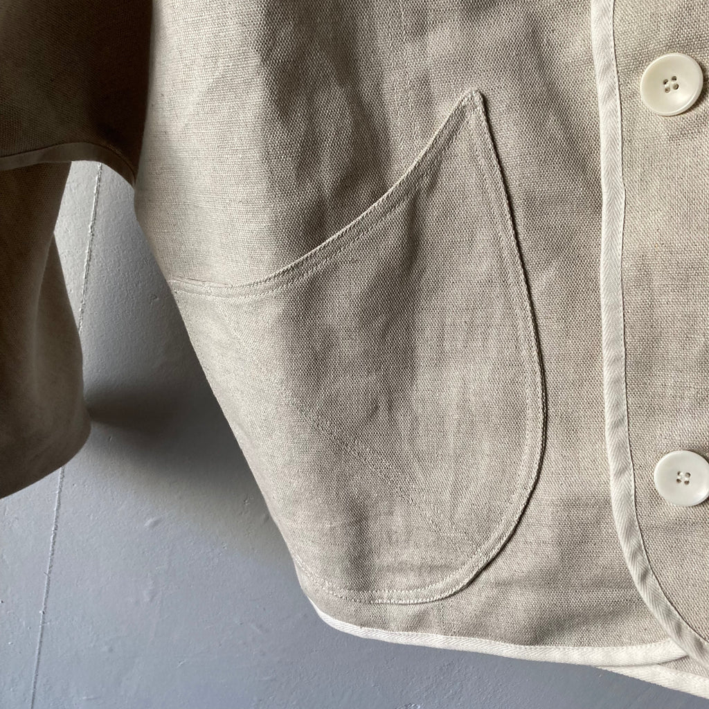名前の通り、曲線を多用したパターンでポケットや脇下の開きなどに特徴があり、しっかりとした綿麻素材(150年以上続くイギリスのブリスベイン・モスのファブリックを使用)を使用。ゆるっとした感じがかわいい。内側は綿テープを使って丁寧に縫製されています。作り手の名前、製作時間、いつ作られたかなどの情報をまとめて縫い付けてあるのも💓丸みのある大きなポケット、ボタンもかわいいですね。セットアップになるカーブパンツもございます。外ポケット2つ、内ポケット1つあり。イギリス製