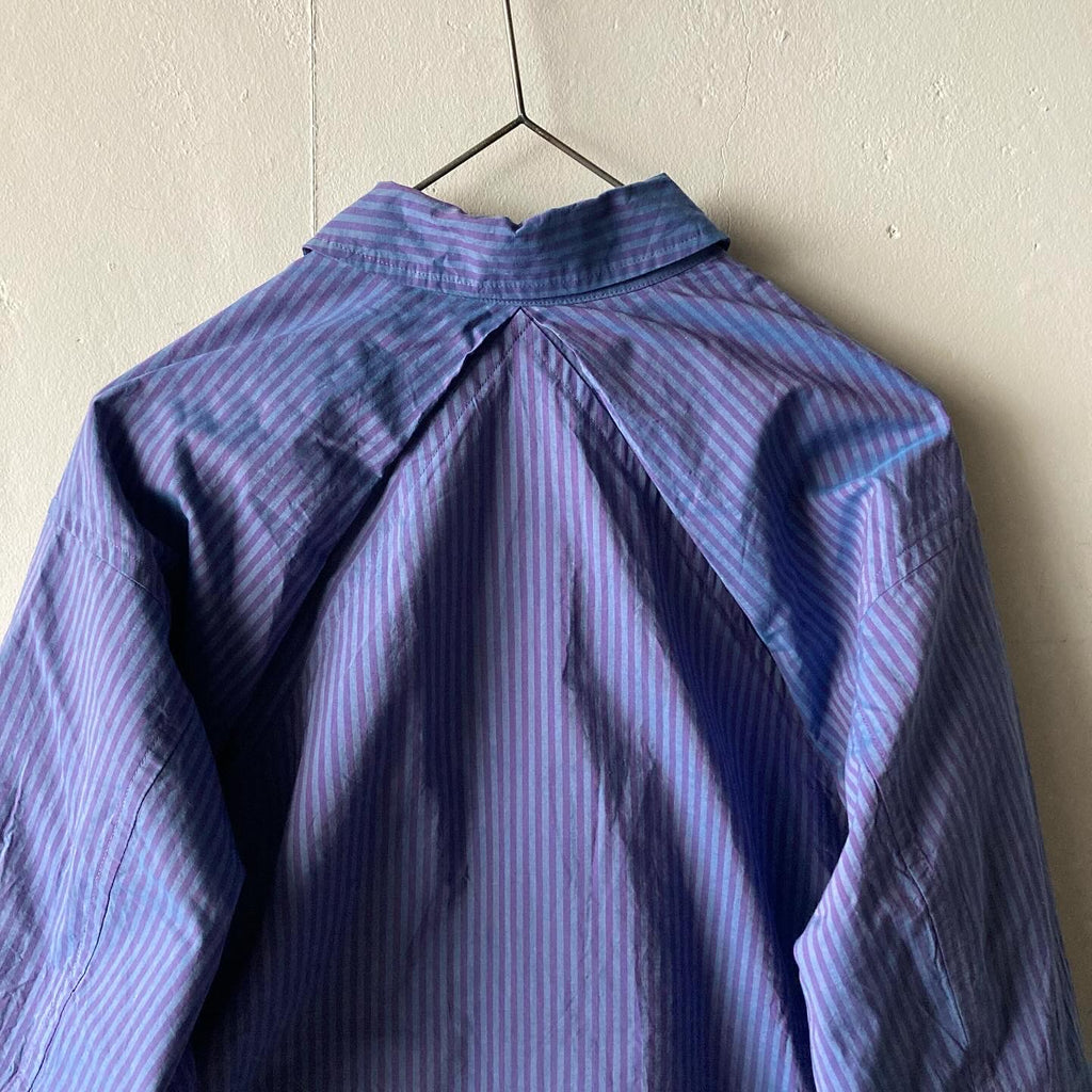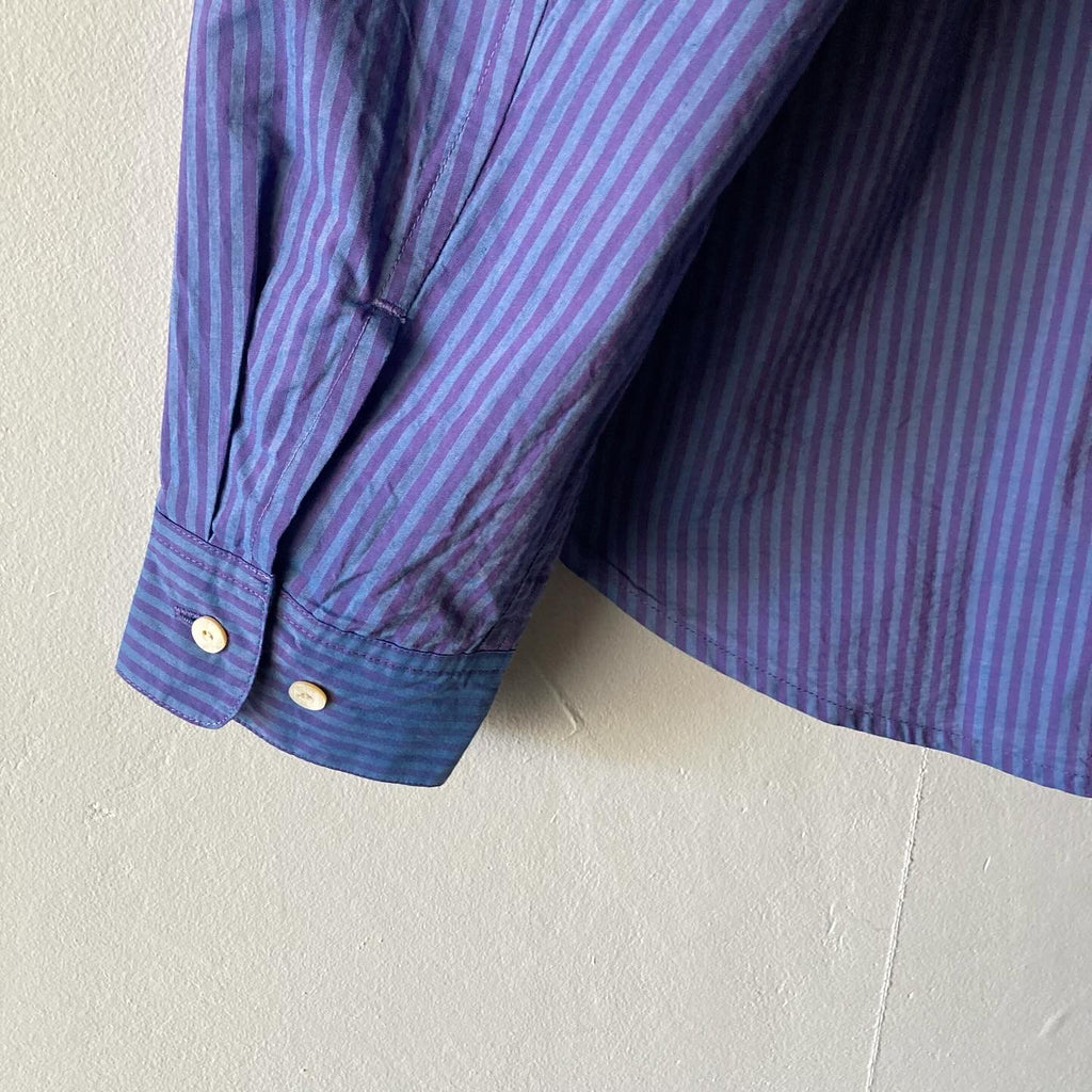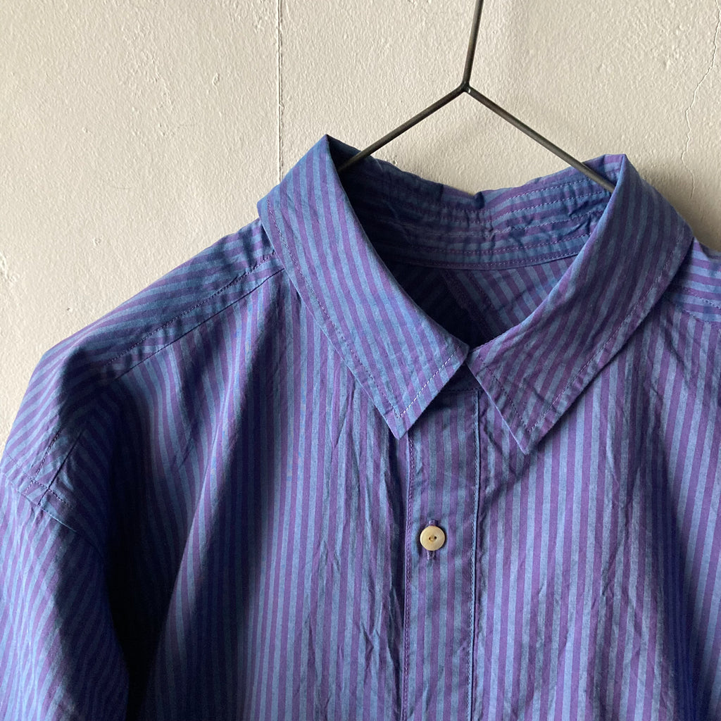 オーガニックコットン生地で仕立てられたキャンディストライプのフリーアームシャツです。玉虫のような、光の当たり具合で色の見え方が異なる柔らかで肌馴染みのよい魅力的なストライプ地。特徴的なバックスタイルかつノーストレスで着ることができる機能性も兼ね備えたシャツです。ポスタルコのものづくりって今までの常識を疑問に思うところからスタートしているものが多いので、すごく今の時代に合っているなぁと思います。