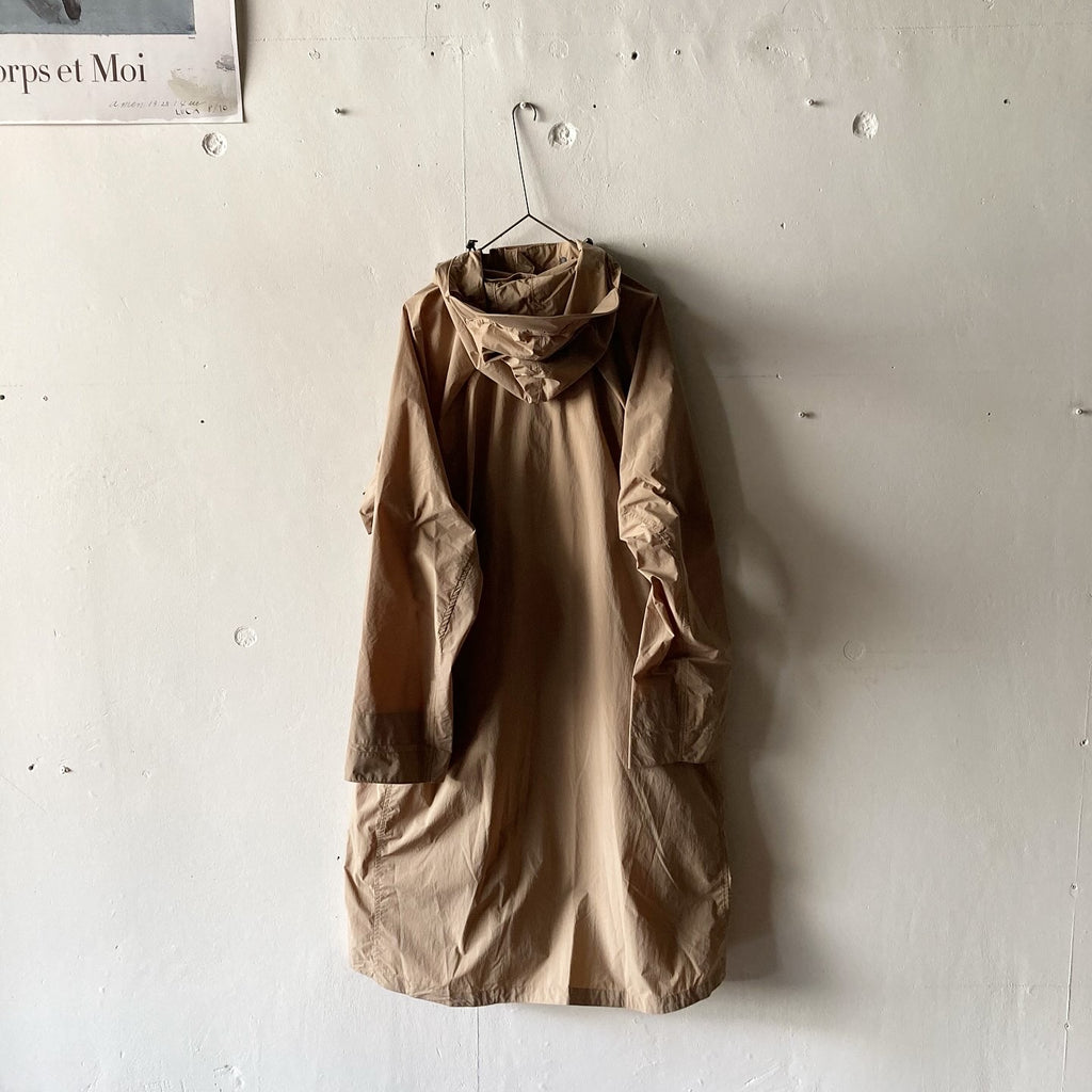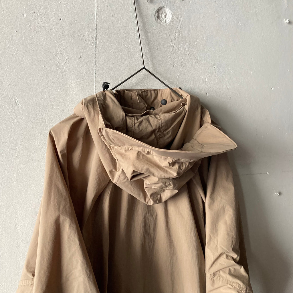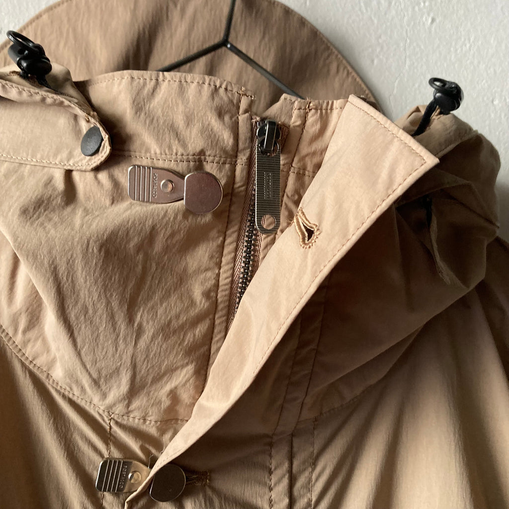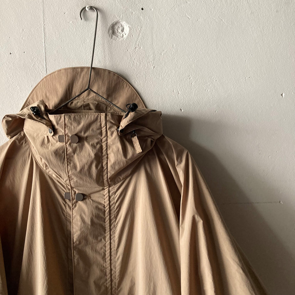 軽いナイロンのロングジャケットです。進化したレインコートと言いましょうか、お馴染みのタブボタン、フリーアーム、そして取り外しできるフードが本格的な仕様でかっこいい!小さく折り畳んで付属の袋に収納することもできますので旅や出張のお供にもピッタリです。