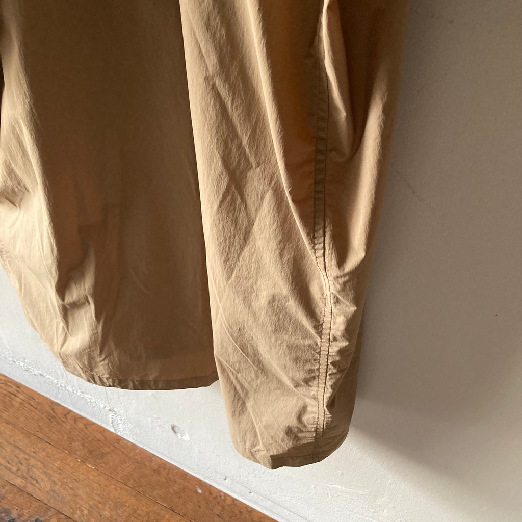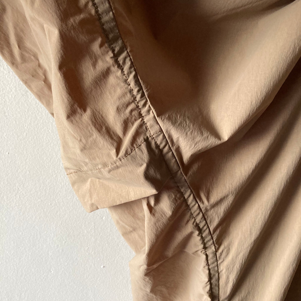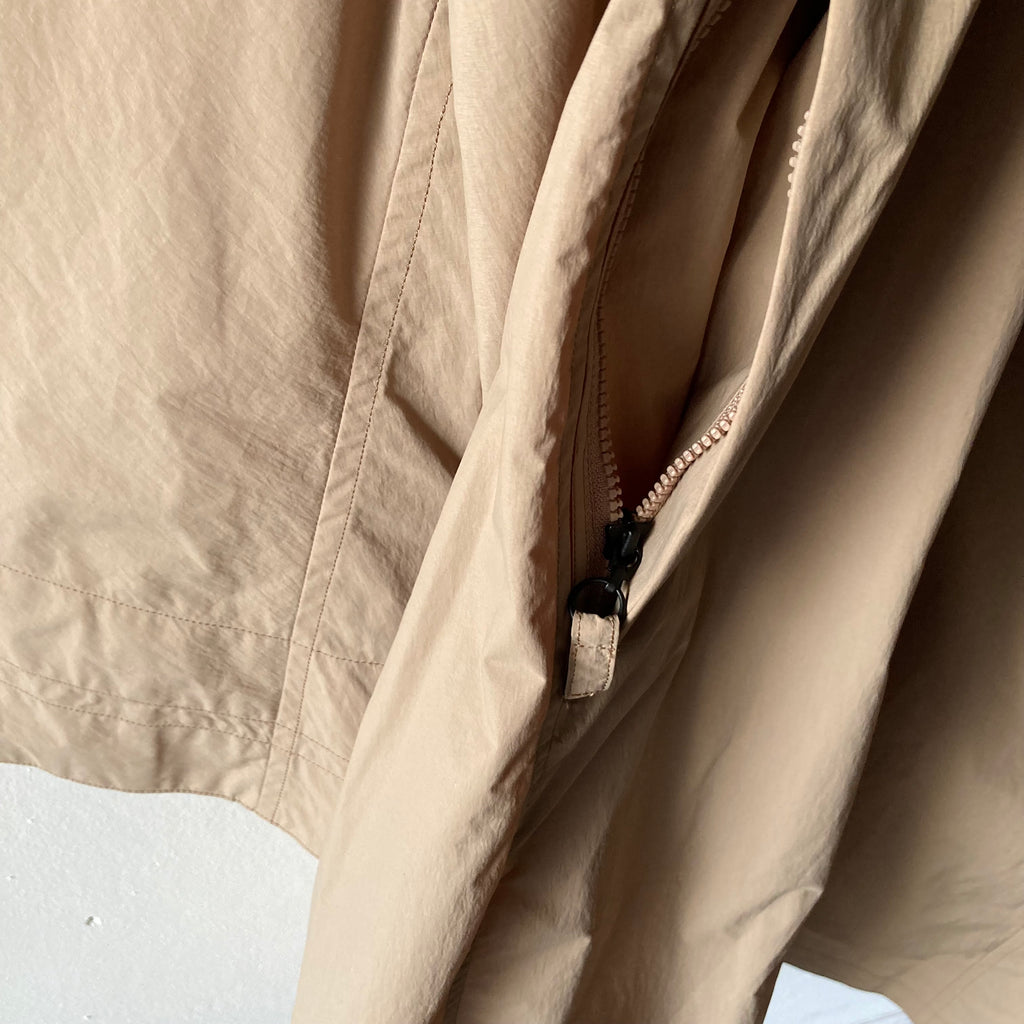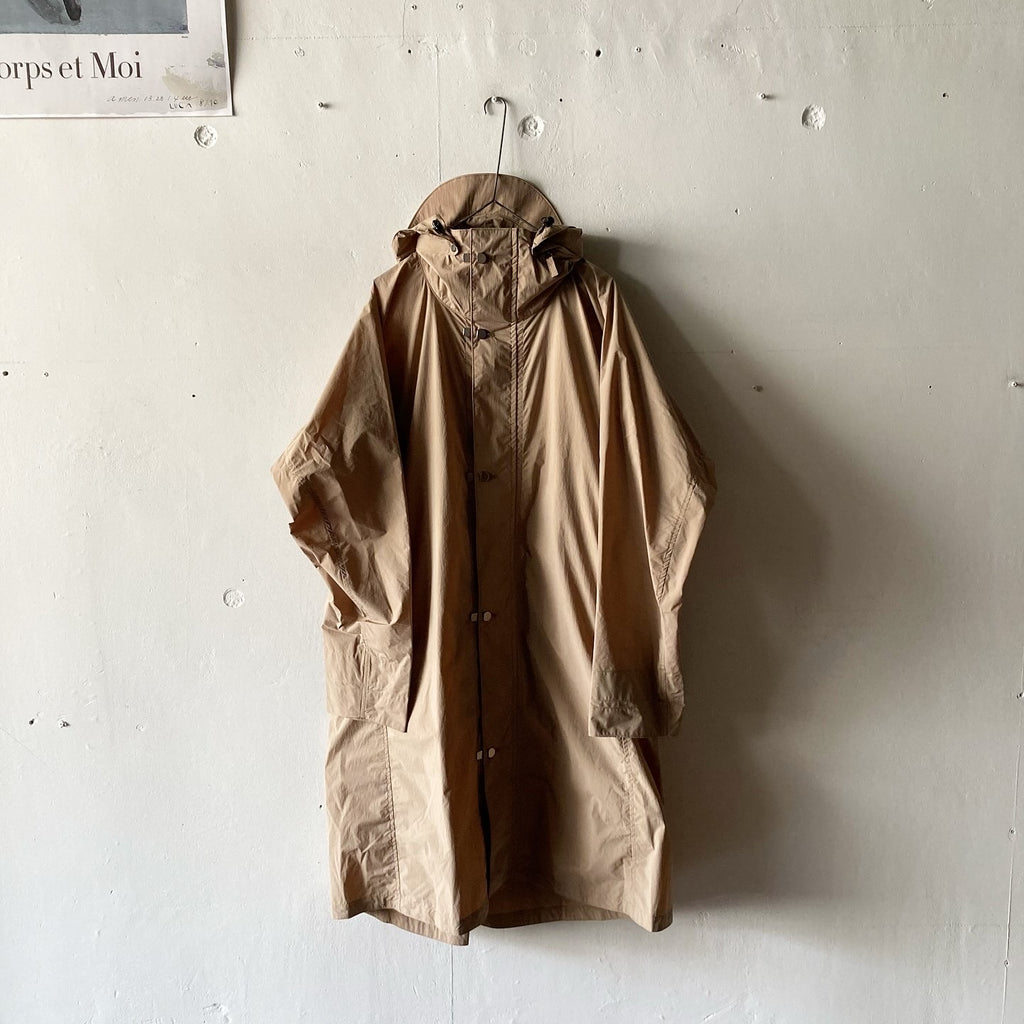 軽いナイロンのロングジャケットです。進化したレインコートと言いましょうか、お馴染みのタブボタン、フリーアーム、そして取り外しできるフードが本格的な仕様でかっこいい!小さく折り畳んで付属の袋に収納することもできますので旅や出張のお供にもピッタリです。