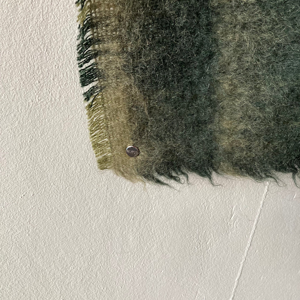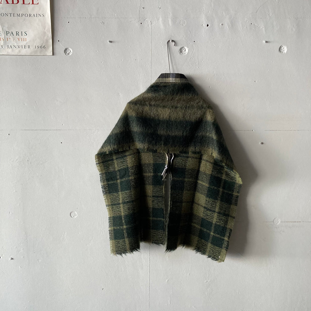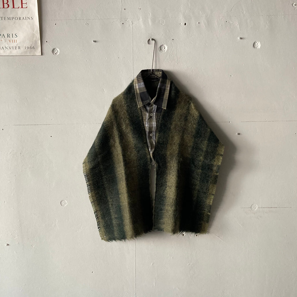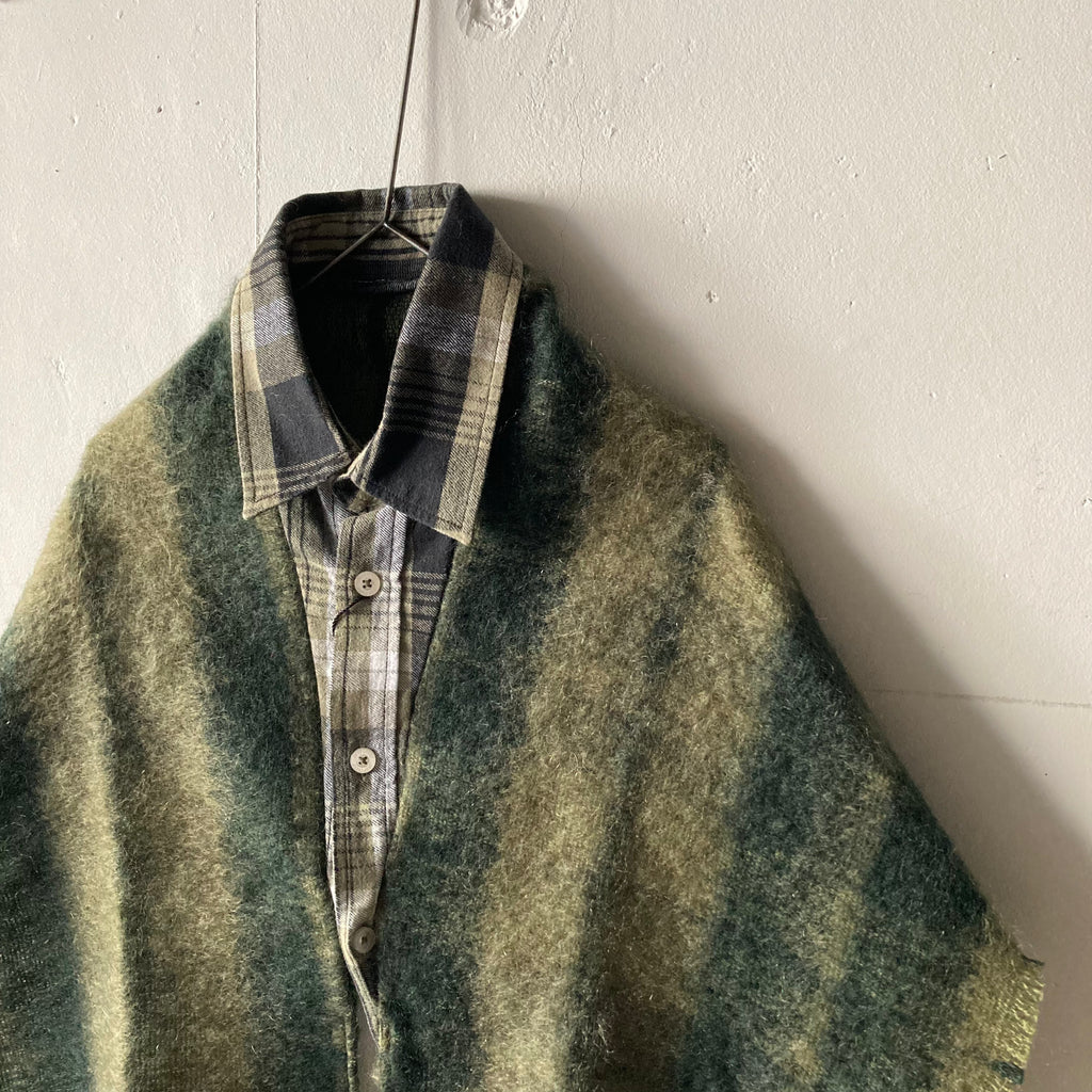 ビンテージのシャツとウールモヘアのマフラーが一体化した羽織もののような巻きものです。シャツとマフラーがグリーン系のチェックでかわいいです。ボタンを全部外してくるりと首に巻いたり、コートの上からサラリと羽織っても🆗 手持ちのシンプルな洋服にプラスすることによってきらりと個性的な着こなしになります。ドイツ製🇩🇪