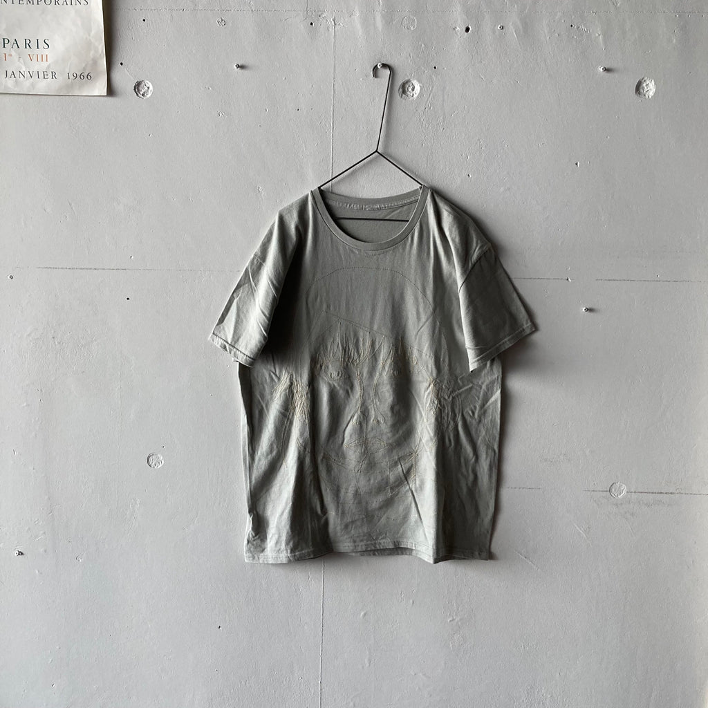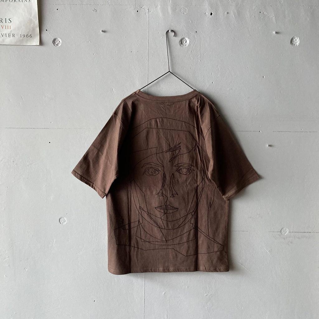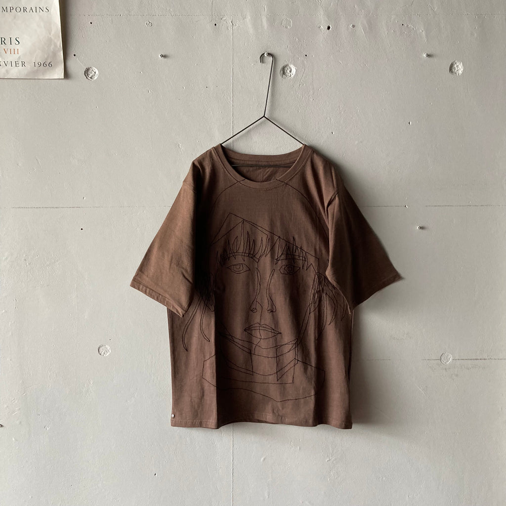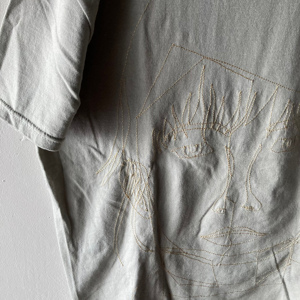定番的にリリースされている、表・裏 異なる人物のステッチを施してあるTシャツです。ちなみに刺繍されている人物は、デザイナーのイネスとデジレー(2人とも女性)のお子さんが男の子だけなので、もし女の子がいたらどんな顔になるか、という、ご本人の写真から架空の女性を作り出したもので、きちんと名前もついているそうです。こういうことを真剣にするBLESSが私はとても好き!すごくしっかりと丁寧にミシン刺繍が施されていて、手工芸好きな方には裏側のステッチ処理も見ていただきたいです。上からカーディガンを羽織ってもバランスよく着こなせます。グレーは他の2色に比べて生地が薄くてやわらかです。