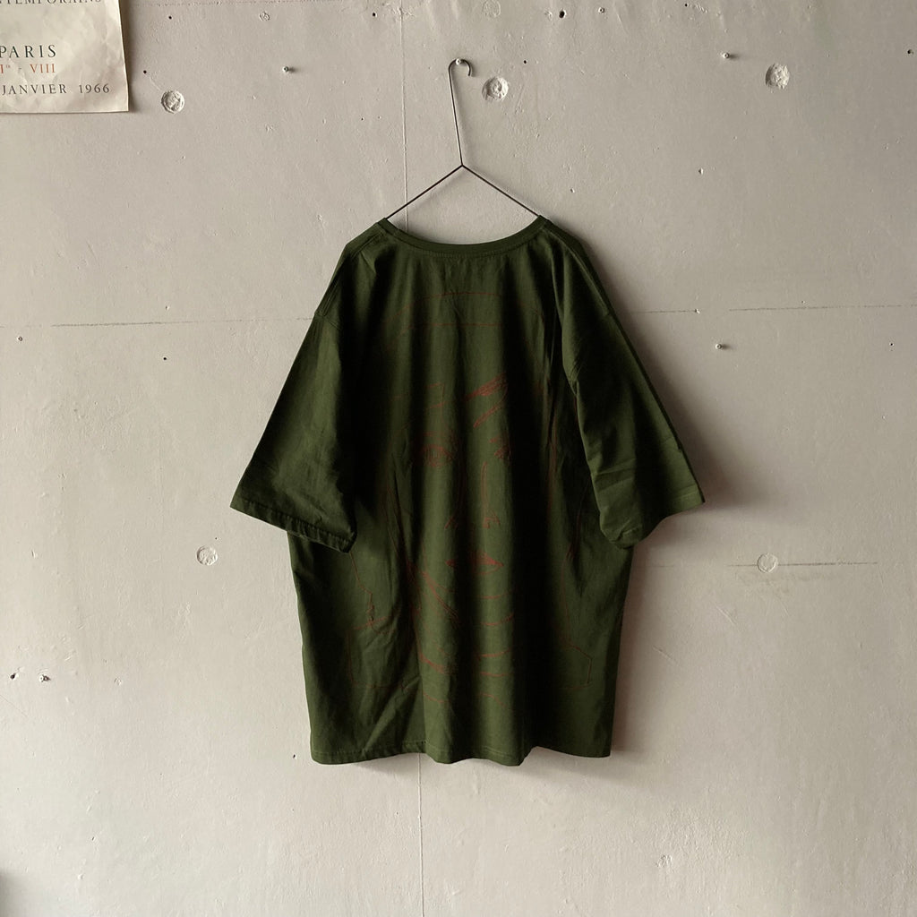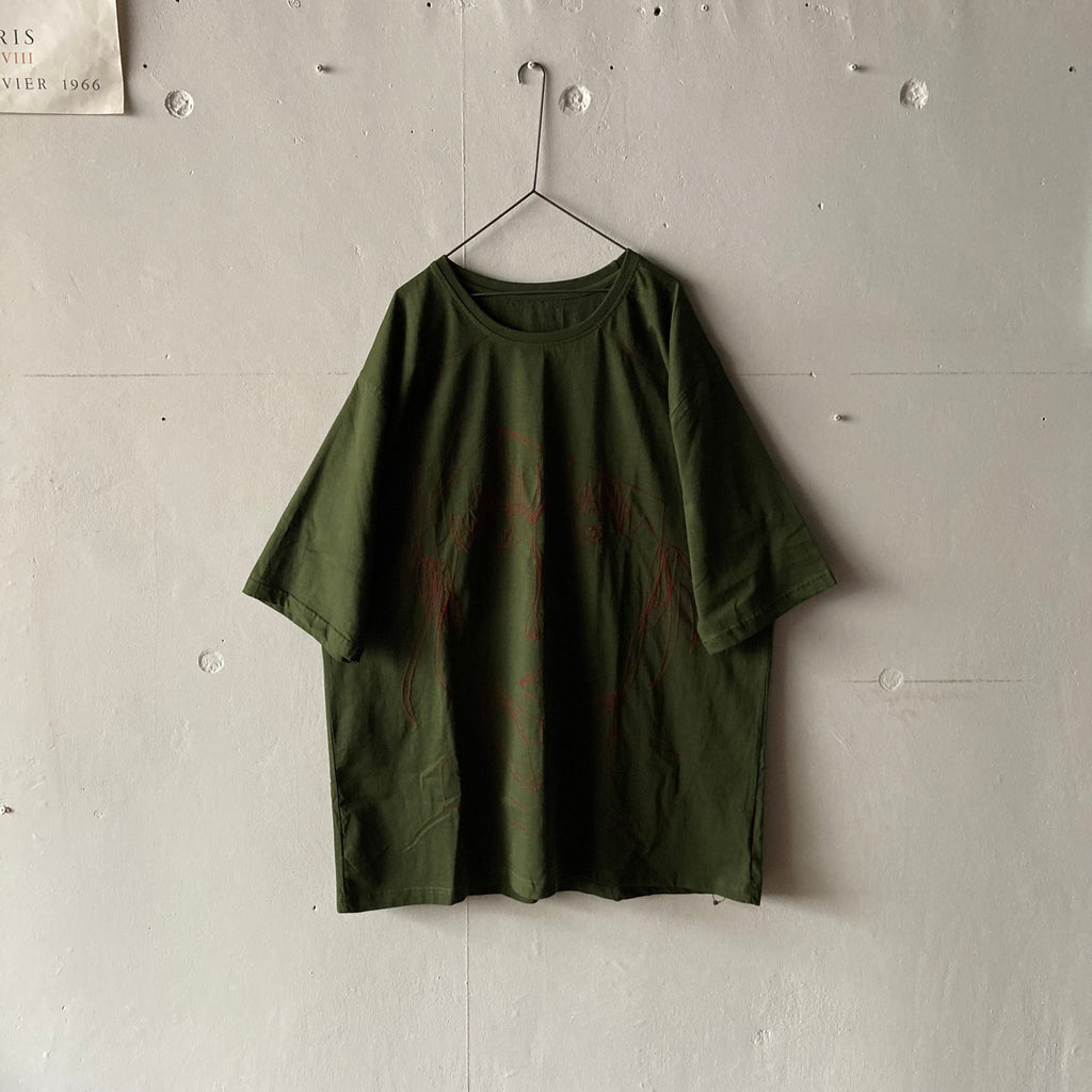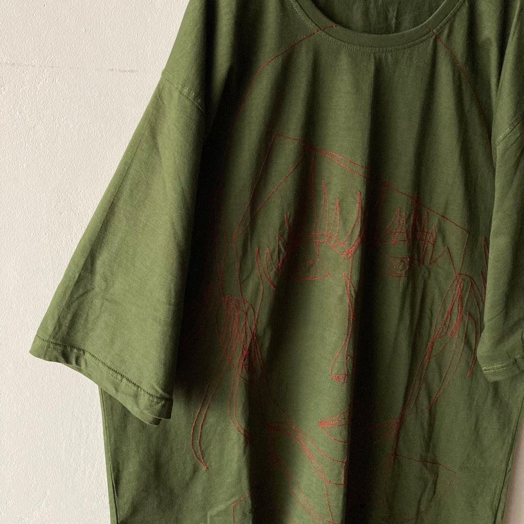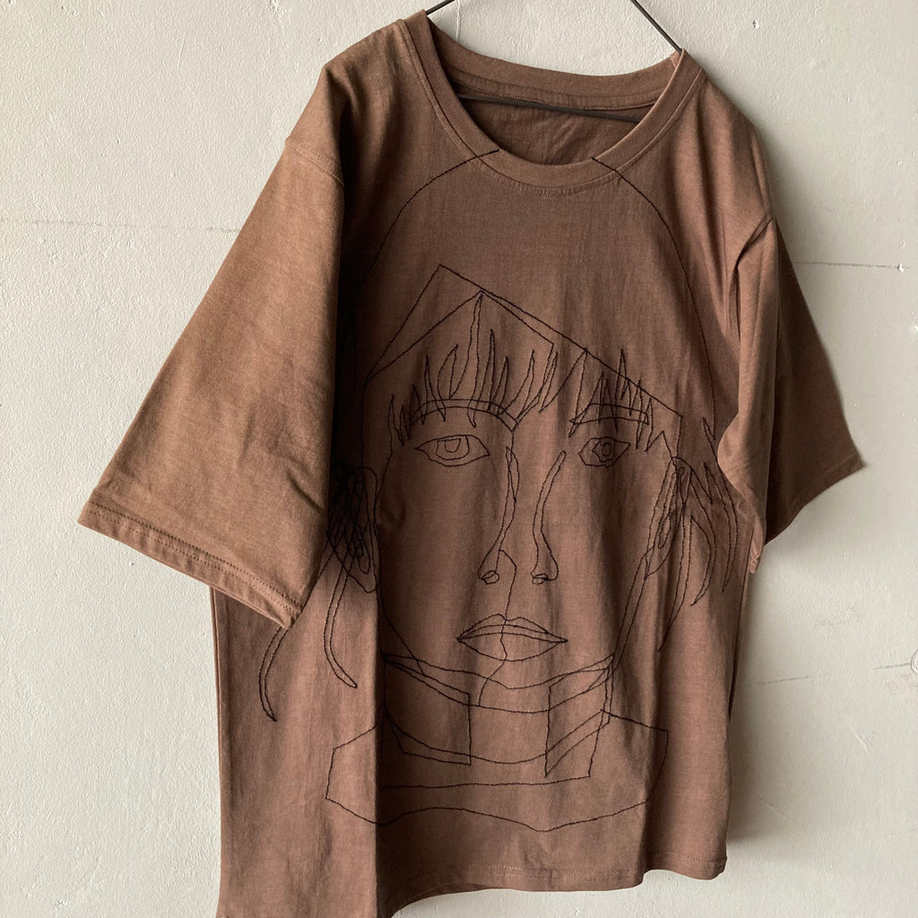 定番的にリリースされている、表・裏 異なる人物のステッチを施してあるTシャツです。ちなみに刺繍されている人物は、デザイナーのイネスとデジレー(2人とも女性)のお子さんが男の子だけなので、もし女の子がいたらどんな顔になるか、という、ご本人の写真から架空の女性を作り出したもので、きちんと名前もついているそうです。こういうことを真剣にするBLESSが私はとても好き!すごくしっかりと丁寧にミシン刺繍が施されていて、手工芸好きな方には裏側のステッチ処理も見ていただきたいです。上からカーディガンを羽織ってもバランスよく着こなせます。グレーは他の2色に比べて生地が薄くてやわらかです。
