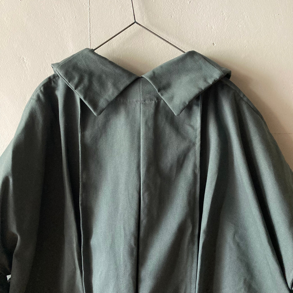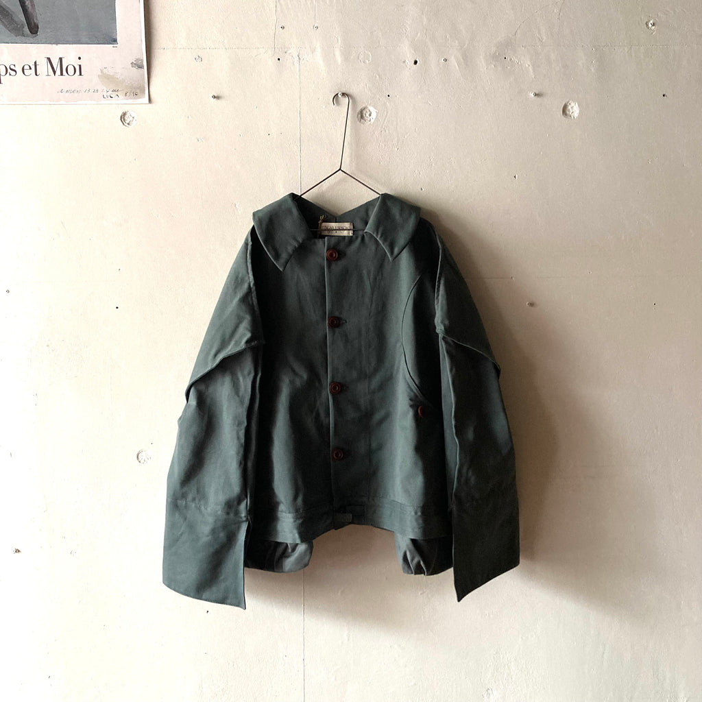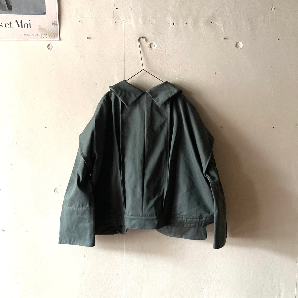 微妙なニュアンスの色が美しいデッドストックコットンで仕立てられたストロングボンバージャケットです。裾のドローコードでシルエットの調整可能。大きく落ちた肩、はみ出たポケット、後ろ姿の特徴的な襟元などかっこよさが詰まった1枚です。ティスカルの作るアイテムの中でもトップスの特徴的な襟が魅力のひとつなのですが、特にバックスタイルがかわいいんですよね。男女問わず着てほしい1枚。アート作品のような特別で流行りとは別次元の、ずっと大事に着たい服です。