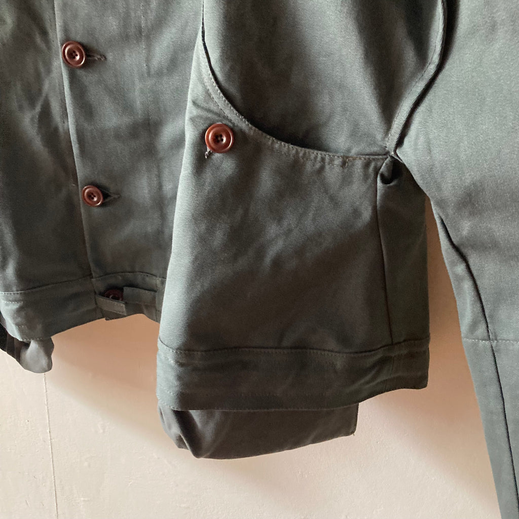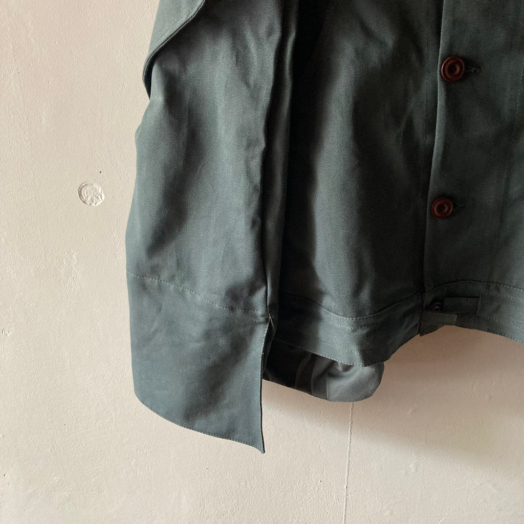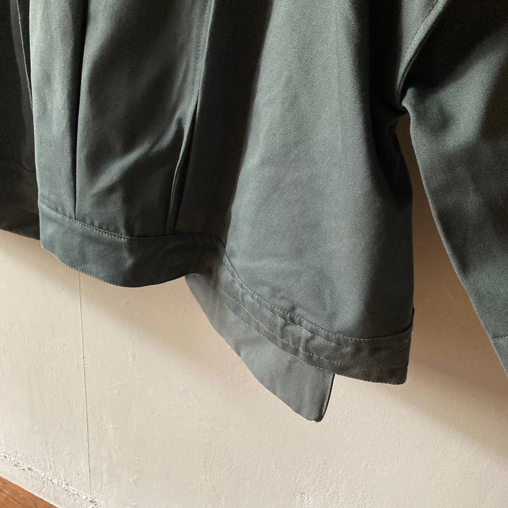 微妙なニュアンスの色が美しいデッドストックコットンで仕立てられたストロングボンバージャケットです。裾のドローコードでシルエットの調整可能。大きく落ちた肩、はみ出たポケット、後ろ姿の特徴的な襟元などかっこよさが詰まった1枚です。ティスカルの作るアイテムの中でもトップスの特徴的な襟が魅力のひとつなのですが、特にバックスタイルがかわいいんですよね。男女問わず着てほしい1枚。アート作品のような特別で流行りとは別次元の、ずっと大事に着たい服です。