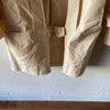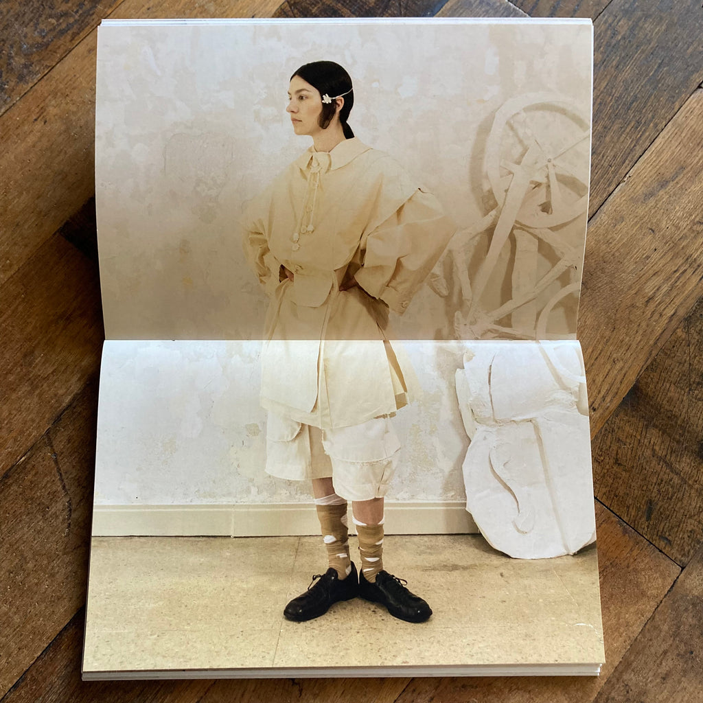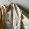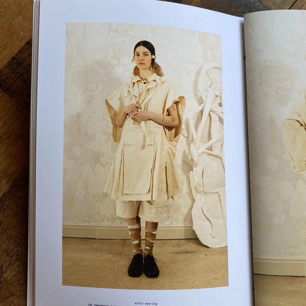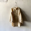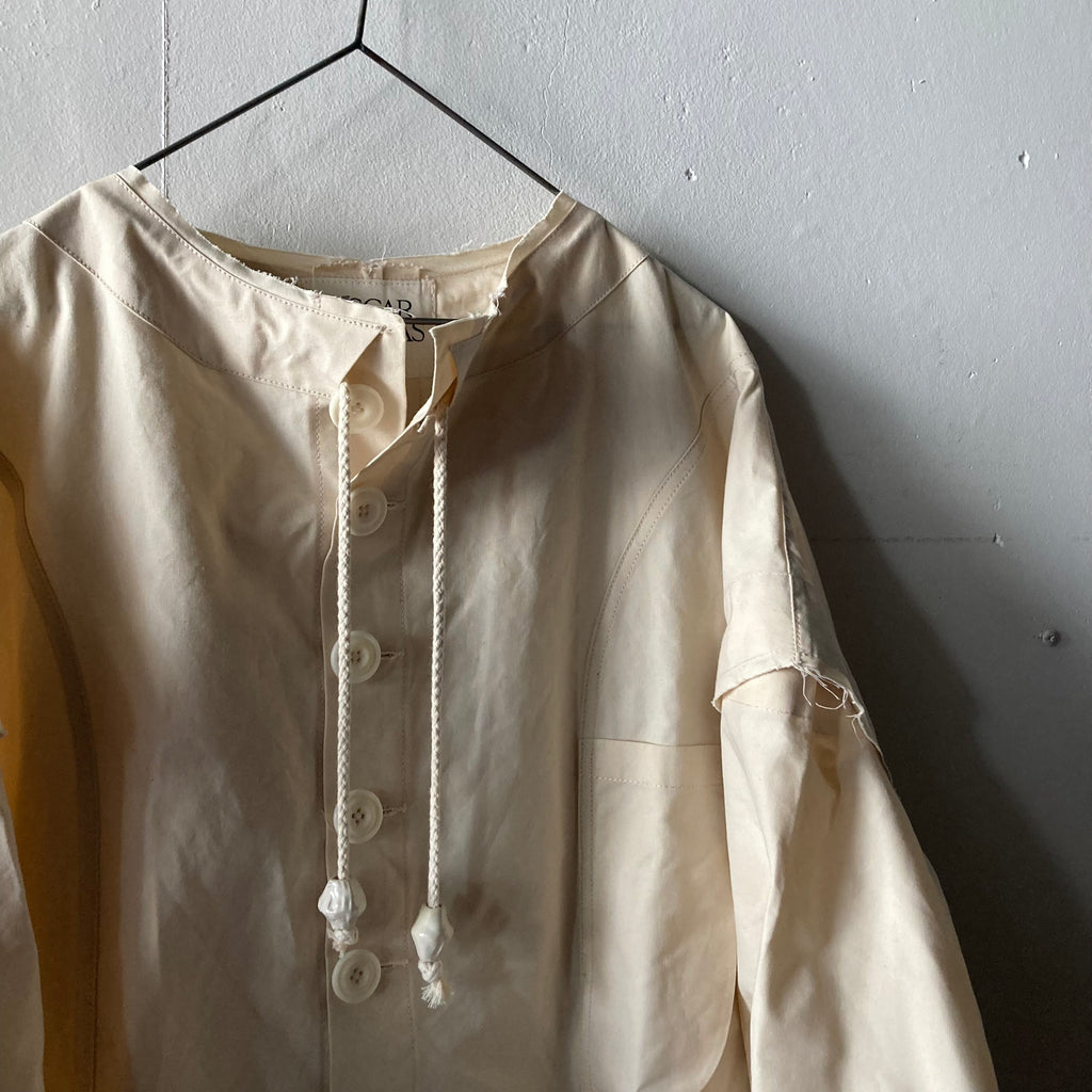 ワックスドコットン製、オーバーサイズのアウターです。袖は取り外しできる仕様になっていますのでお好みでいろいろお楽しみいただけます。前見頃の大きなポケットに入ったミシンステッチ、後ろ姿のボリューム感、デザイナー本人の手仕事による陶器のビーズボタンなどこだわりがギュッと詰まった1枚です。3/20のシリアルナンバー入り。スペイン製