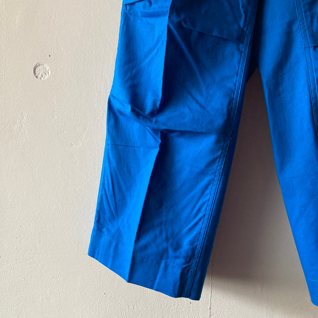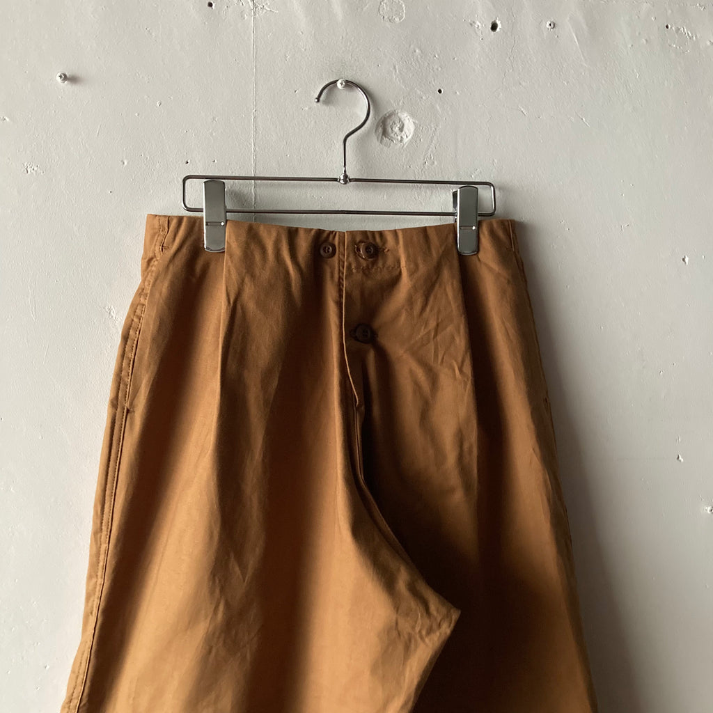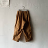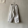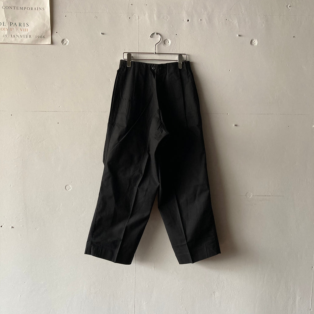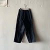 夏の定番、シーチング素材のパジャマパンツです。前後反転モデルで、前身頃にボリュームが出て、後ろ見頃はすっきり、太めのシルエットにタックが部分的に挟んであり、TUKIらしい独特のシルエットを描きます。ウエスト部分はボタンで2段階調節可能、ジャストウエストでも、落として腰で穿いてもかっこいいです。最初は糊が効いた状態ですが、洗濯すると若干縮み、柔らかく馴染んで穿きやすくなります。何より軽くとても涼しいので、うだるような暑い夏のおしゃれ心を忘れそうなときに穿いてください。両サイドポケットあり。