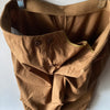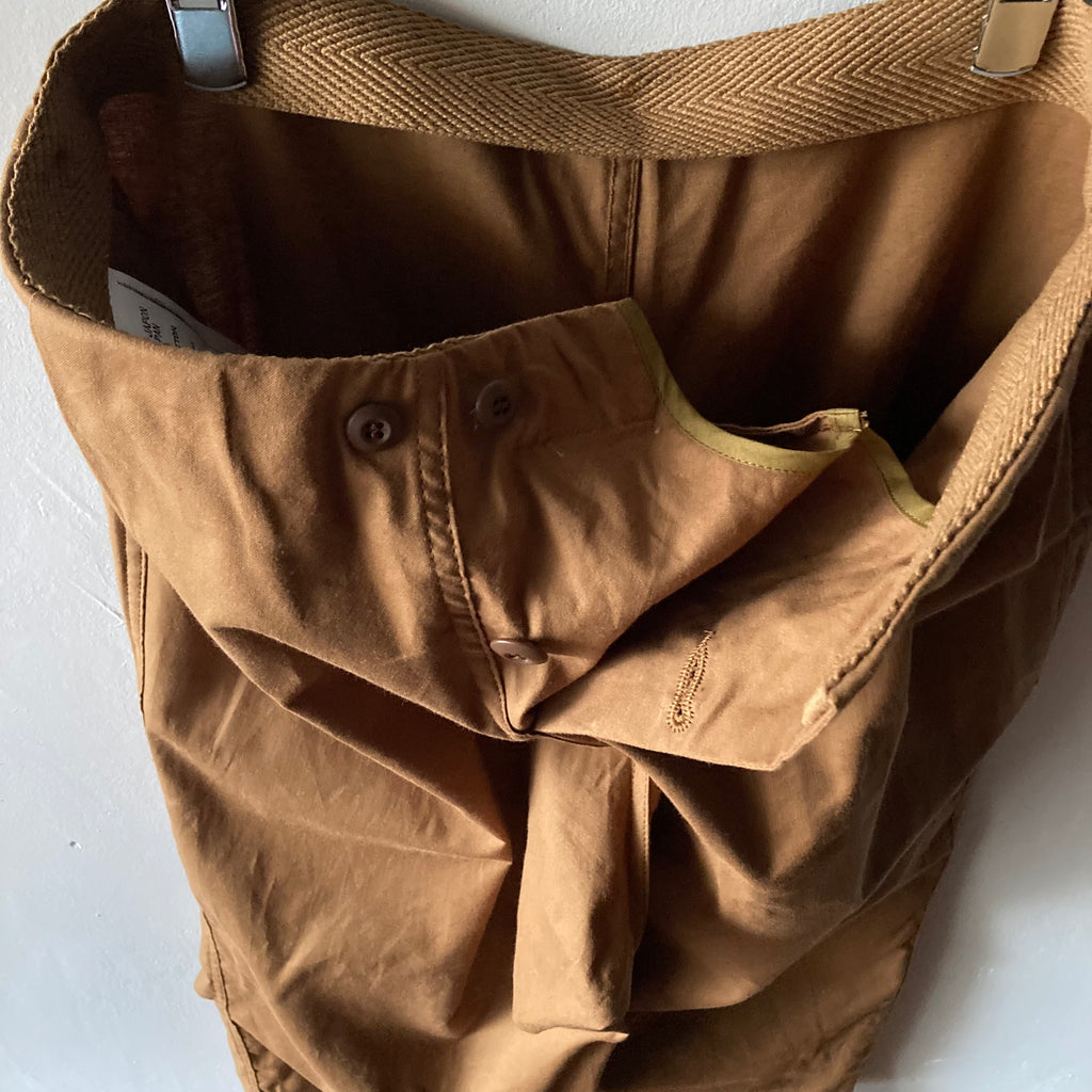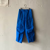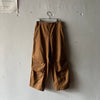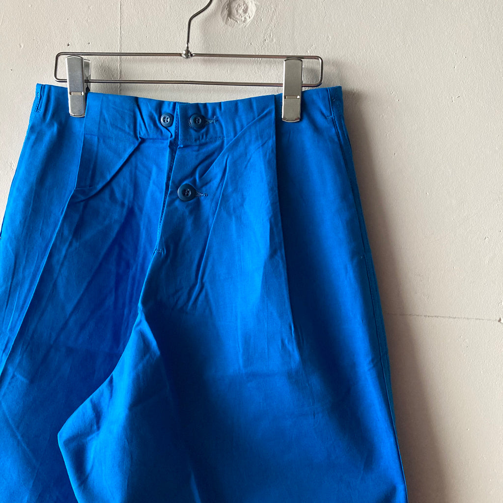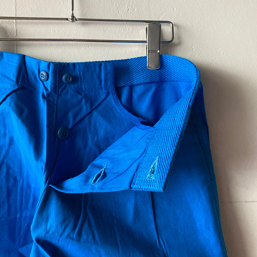 夏の定番、シーチング素材のパジャマパンツです。前後反転モデルで、前身頃にボリュームが出て、後ろ見頃はすっきり、太めのシルエットにタックが部分的に挟んであり、TUKIらしい独特のシルエットを描きます。ウエスト部分はボタンで2段階調節可能、ジャストウエストでも、落として腰で穿いてもかっこいいです。最初は糊が効いた状態ですが、洗濯すると若干縮み、柔らかく馴染んで穿きやすくなります。何より軽くとても涼しいので、うだるような暑い夏のおしゃれ心を忘れそうなときに穿いてください。両サイドポケットあり。