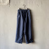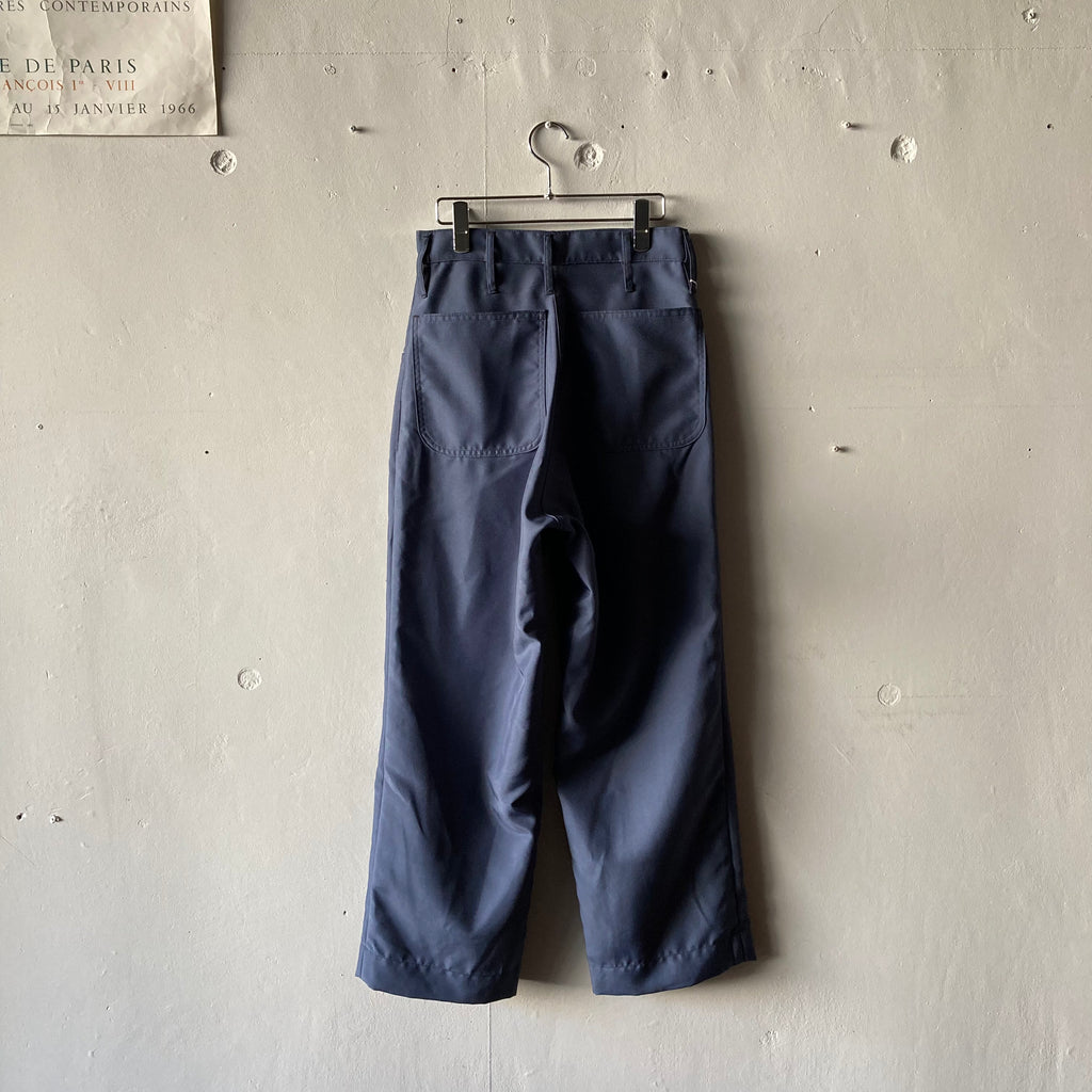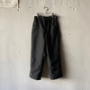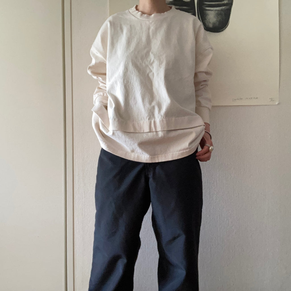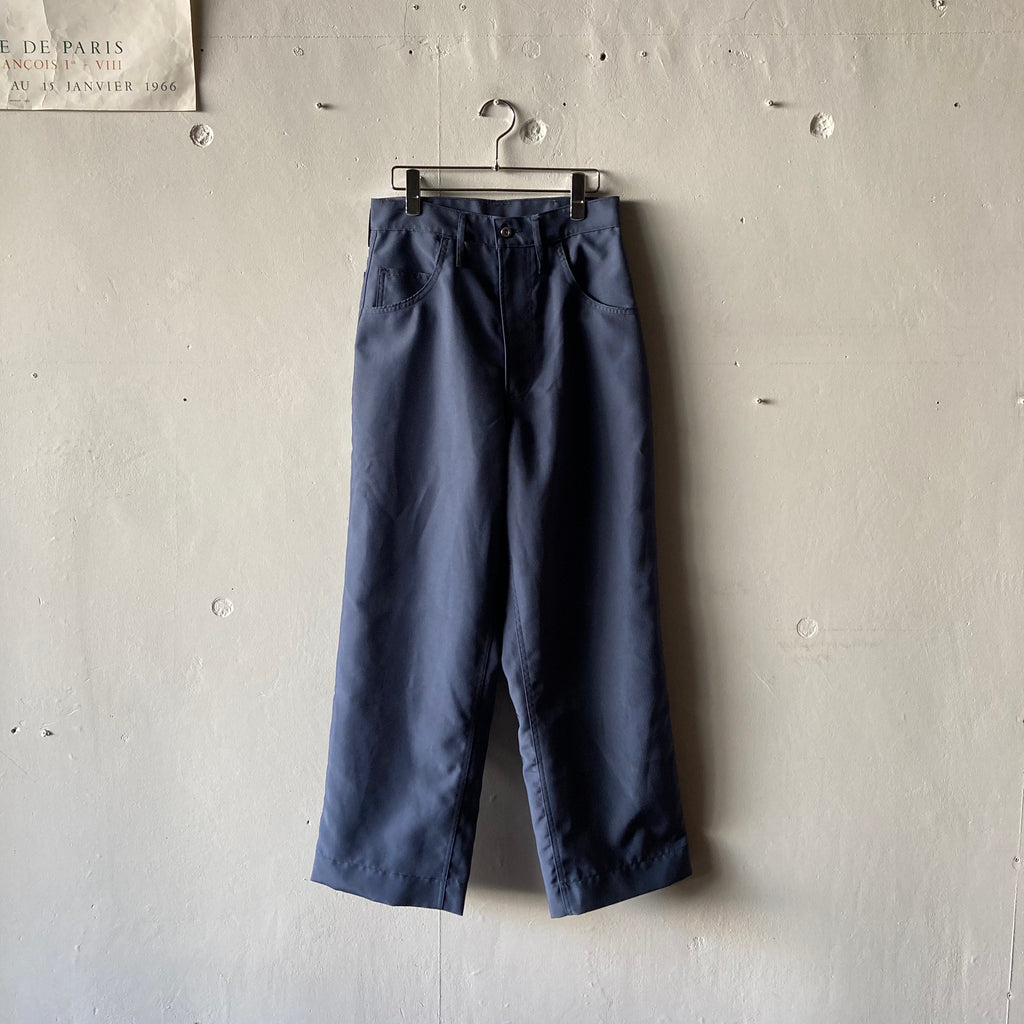 鈍い光沢感が魅力的なポリエステルキャンバスの5ポケットパンツです。シンプルで太めのライン、穿くとやっぱりTUKI独特のシルエットが出てとてもかっこいい!です。ポリエステルキャンバスは皺になりにくく、すぐに乾くので旅行の際にもピッタリ、軽い穿き心地は例えるならジャージを穿いているような感じでしょうか。コットンとはまた違った素材感が新鮮な1本です。少しハイウエスト気味に穿いて、女性らしい着こなしをするのもおすすめです。洗濯による縮みはほとんどありません。