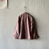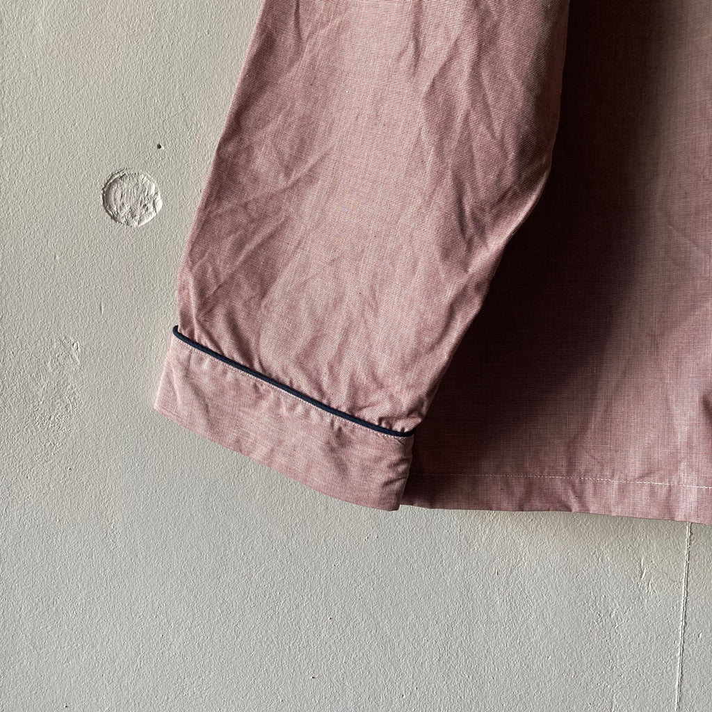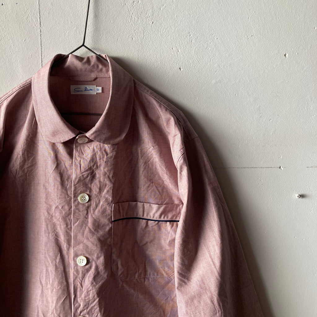 丸襟のパジャマシャツです。パジャマシャツの定義って?という質問にうーんといろいろ考えてみましたが、明確な定義はないかもという結論に。強いて言えばカフスがないところかな。あと、ポケットや袖口にパイピングがちらっと見えているところがパジャマっぽい、のか。何はともあれ、こちらは外着用として真面目に作られたシャツです。「やだ、パジャマ着てきたの?」と言われないようにコーディネートするのがおしゃれのキモです。例えば、かっちりとしたパンツをウエストインして合わせるとか・・・あれこれ考えるのが楽しい1枚です。