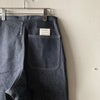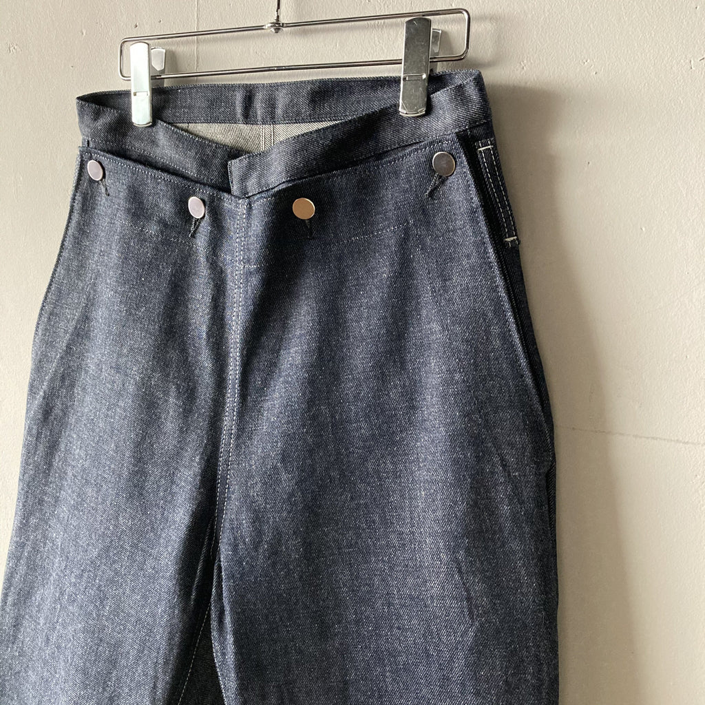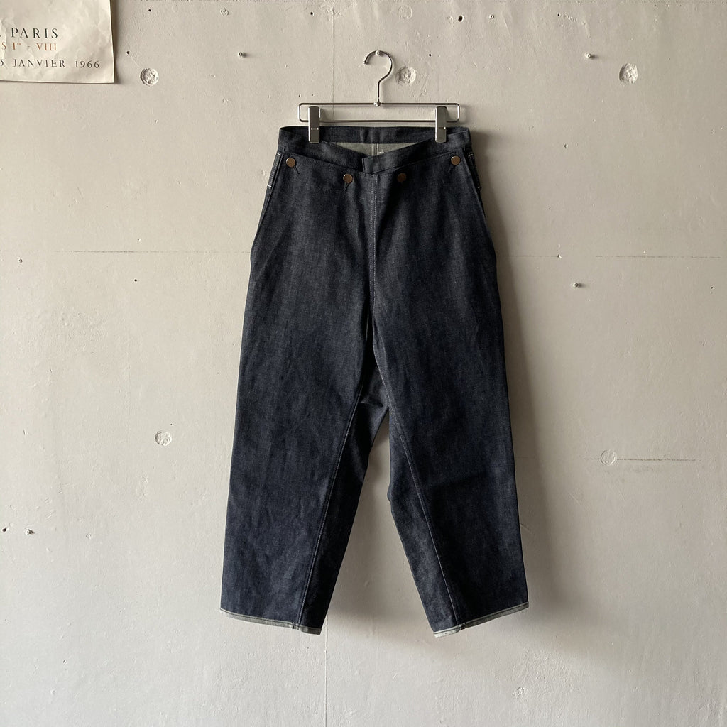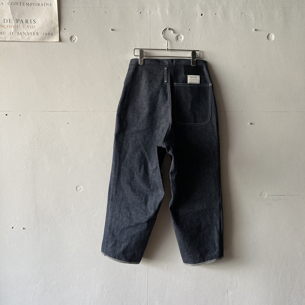 TUKIの代表的なモデルTYPE3。ウエストはミリタリーネイビー仕様、少しヒップの下がるサルエルに近いシルエット、裾にかけてテーパードが効いており、丈は短めに設定されています。穿く人によって表情がこれでもか、というくらい変わる、不思議とその人に寄り添う懐の深いパンツでもあります。糊が効いた状態で穿きこむのもいいですが、一度洗濯すると、柔らかくなり穿きやすくなります(少しだけ縮みます)。洗濯を繰り返すとデニム地特有の時計周りのねじれが出てきますが、着用には問題ありません。TUKIの世界観を色濃く表している1本です。