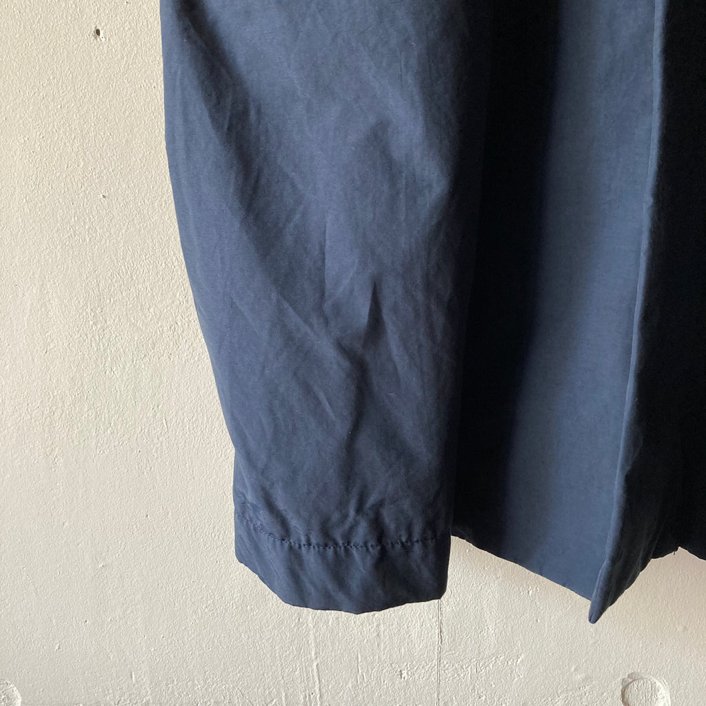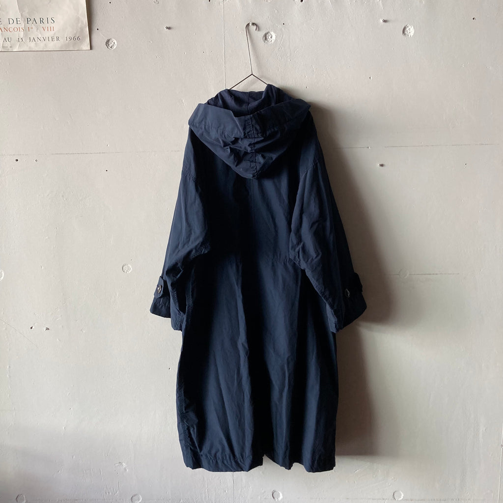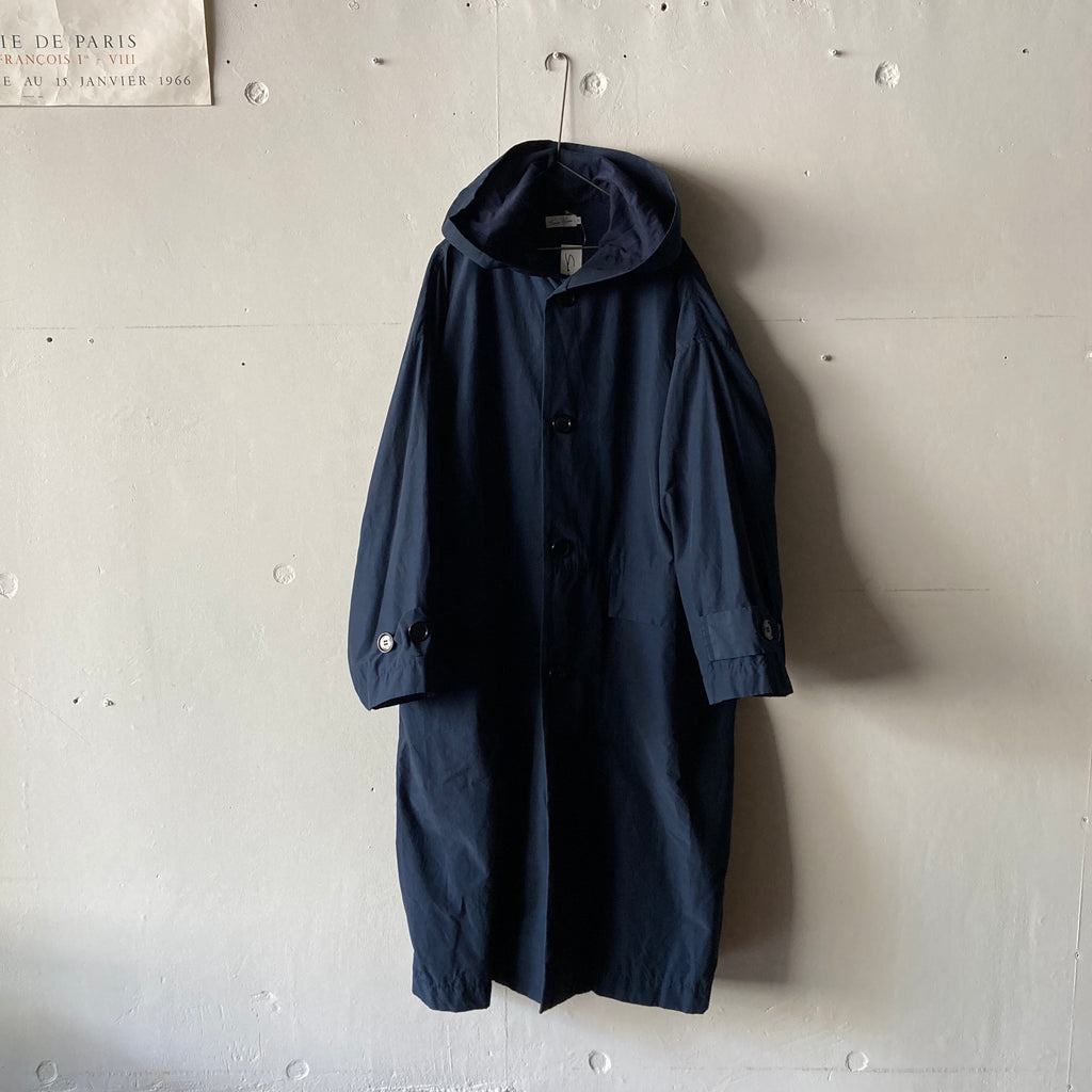 コットンポリエステルのウェザークロスにコットンジャージの総裏が付いた軽いコクーンシルエットのコートです。フードからチラリと覗く裏地、大きなボタンなど、シンプルさの中にぎゅっとこだわりが詰まった1着です。袖が長い場合は折り返して裏地を見せてもいいですし、付属のベルト部分をボタンでぎゅっと絞っても。セットアップになるゴムパンツもございます。