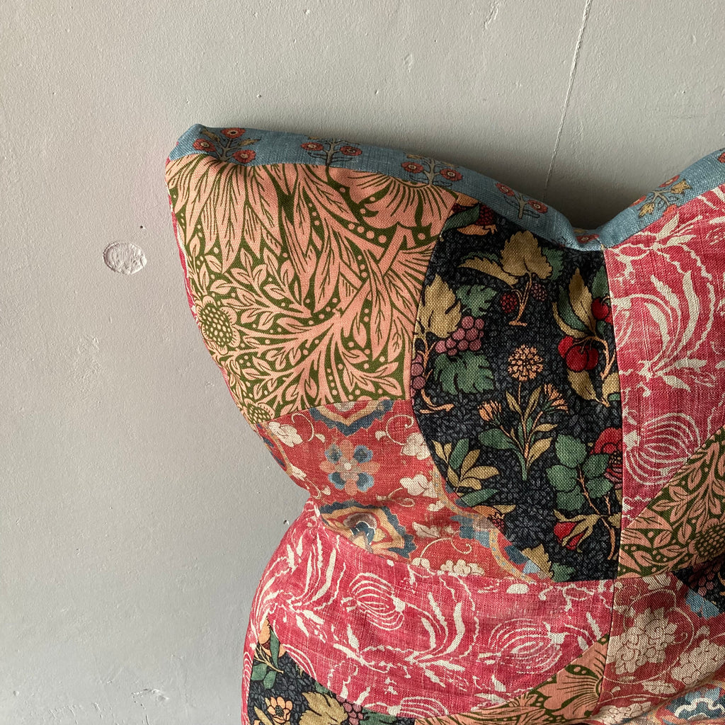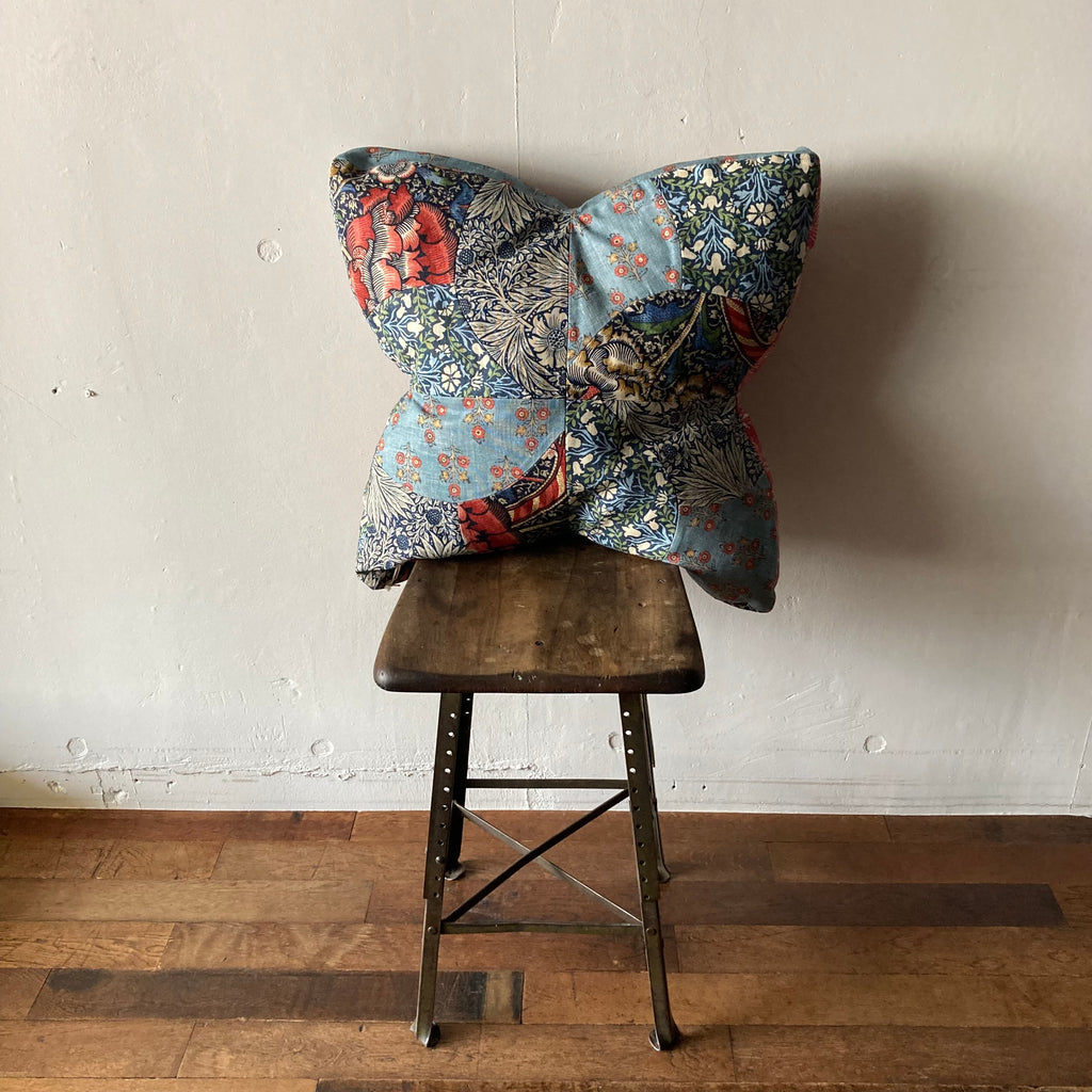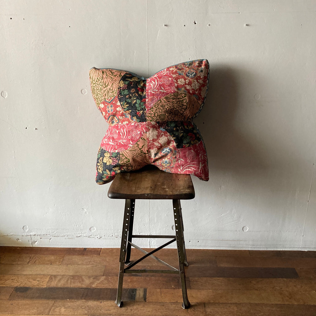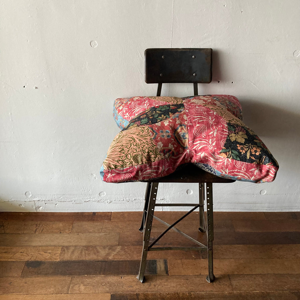 貴重なプリント柄の生地をパッチワークした大型のクッションです。想像以上に大きいです。形も可愛くて、生地は見惚れてしまうほどの素敵さ…アンティークやビンテージのものがお好きな方には響く一品です。意外と和室に置いてもしっくりくるのではないか、と思います。あー私も好き、私も欲しい笑 オーストリア製