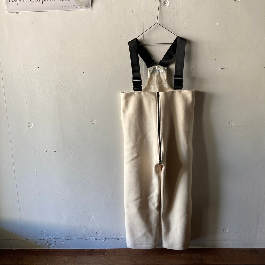 ウールメルトンのウェーダーです。よく本格的な釣り人が胸元までゴム引きの吊りパンツを穿いている姿を見かけますが、その形を日常着にアップデート、無骨な雰囲気は残しながらもカジュアルになりすぎないところがサンリミットらしい1着です。肩のベルトである程度調節ができるので、比較的低身長〜高身長の方にも対応できる仕様になっています。前見頃、股下までダブルジップで開閉できますので、男性のトイレの際も問題ありません。パキッとブラックと合わせるとかっこいいです!両サイド、ヒップに1つポケットあり。アウターに使われるような、しっかりとした素材です。
