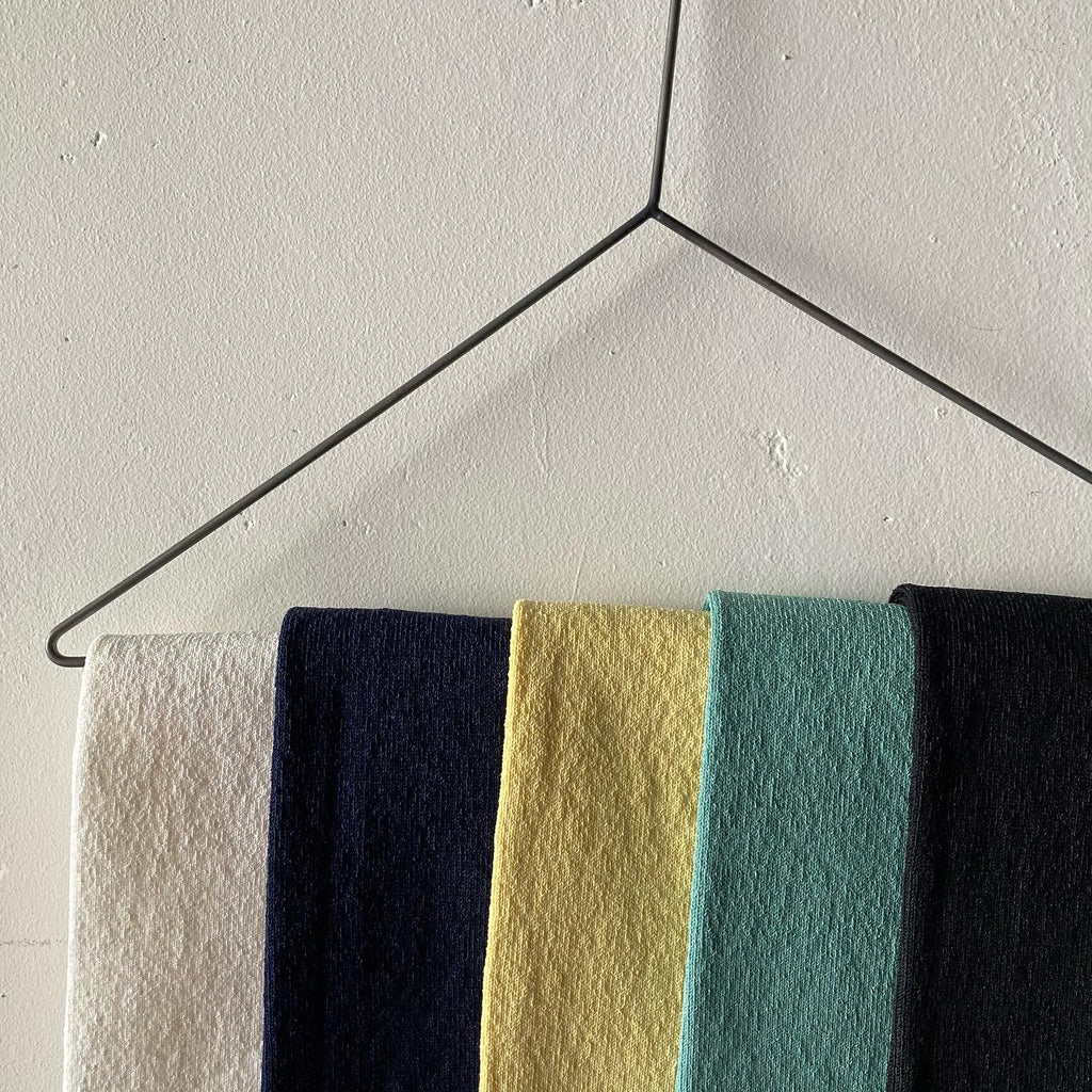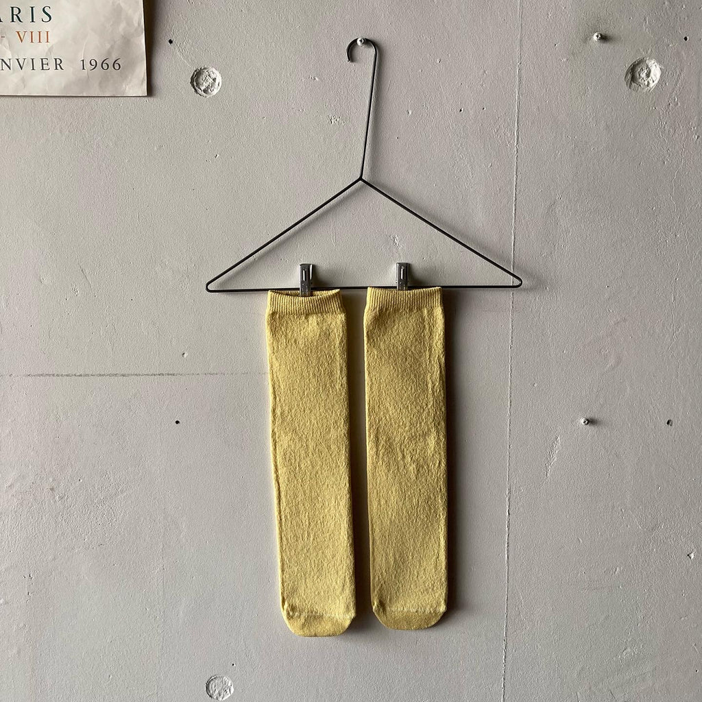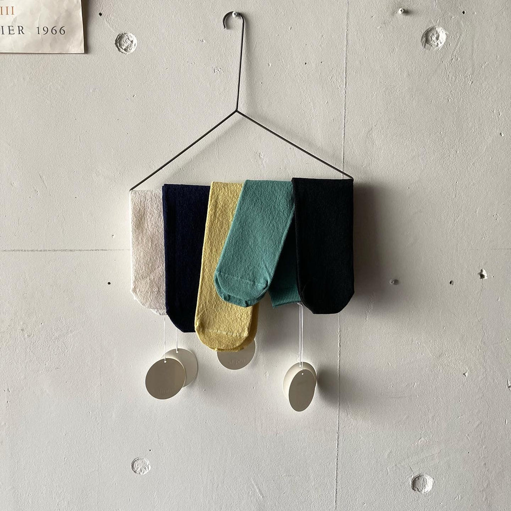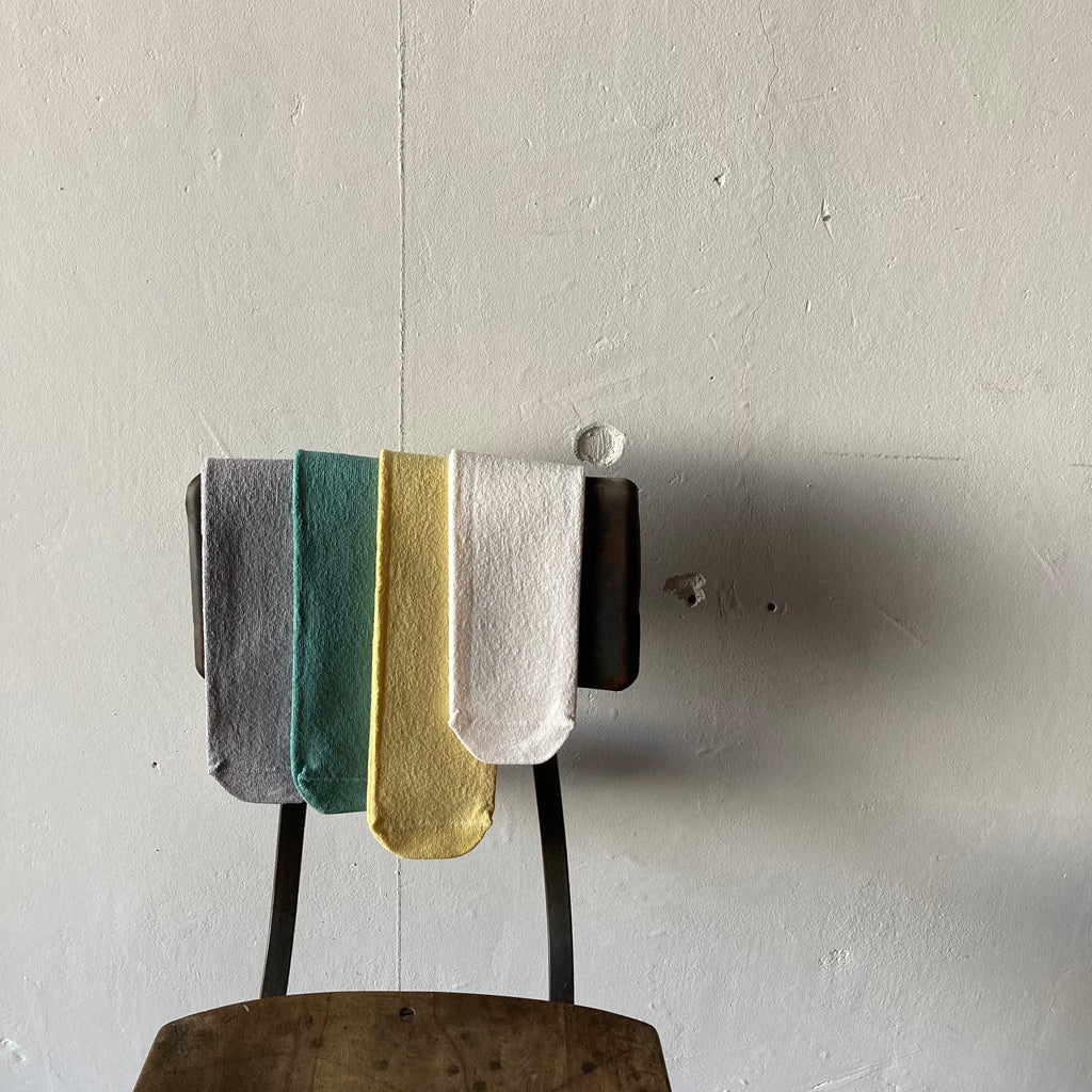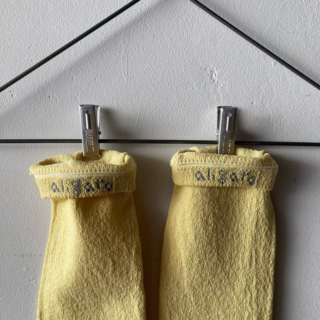メリノウールでご紹介したソックスと同型、ペーパー素材のチューブソックスです。踵がなくフリーサイズ展開なので、ギフトにもピッタリです。ただ筒状になっているだけじゃないの、と思われるかもしれませんがそれでは足に添いません。このソックスは、穿き口あたり、踵あたり、爪先あたりと3層に分けて編み方のテンションを変えてあります。リブ部分をひっくり返すとaligato(ありがとう)、両足揃ってaligatos(アリガトス・ブランド名)になるという、ユーモアと実用性を兼ね備えた1足です。こちらは紙糸と機能糸を掛け合わせ吸放湿性が優れたハイブリッド素材で、独特のシャリ感があります。吸放湿性やドライ機能に優れているため、運動や登山の際にも快適に穿けます。これから暑くなる季節にも快適に過ごせる1足です。そして何より、一般的な靴下よりも5倍以上の強度があるのだとか。私も穿いていますが、最初の姿からほとんど変化なく美しいままを保っています。
