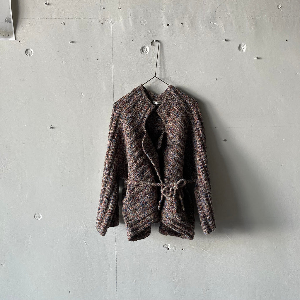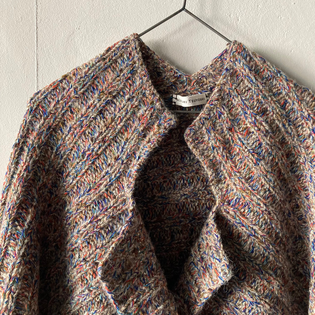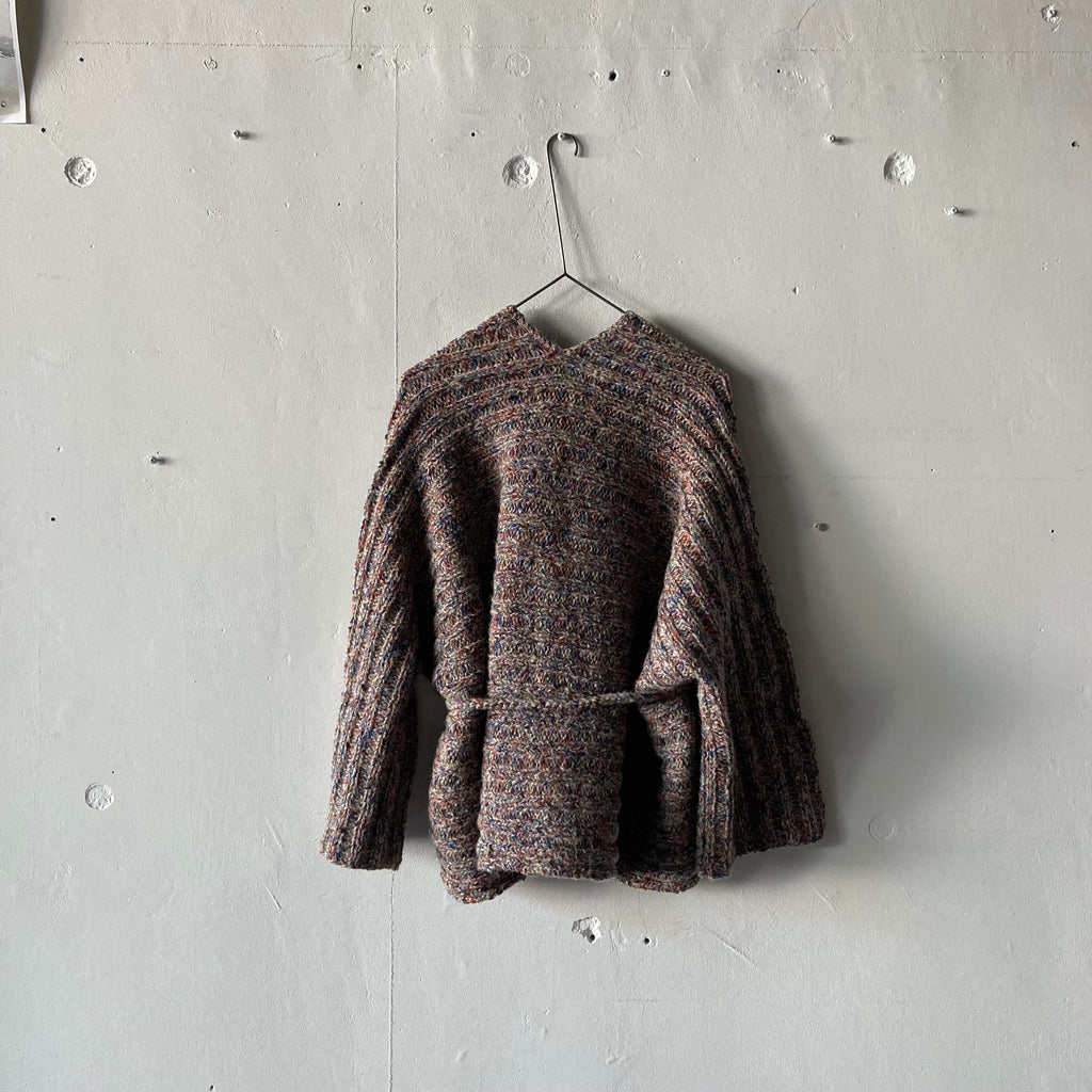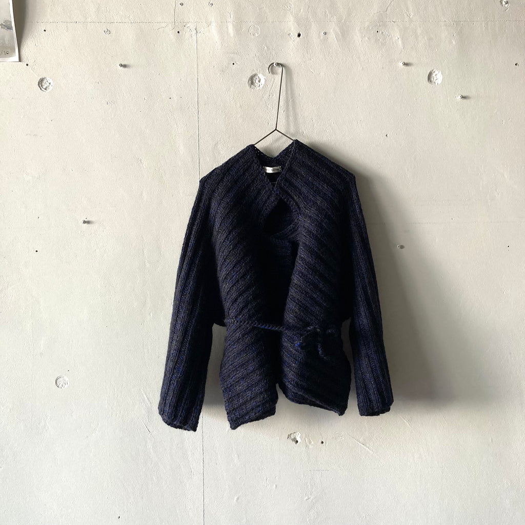多本の糸で独特の色の表情を作るのがヒロミツヨシ独自の魅力を放つ真骨頂だと思っているのですが、こちらもひたすらにか・わ・い・い♡です。明るい多本取りのハンドニットは7本どり、ネイビーと黒のハンドニットは4本どりでどちらも甲乙付け難く、見れば見るほど唸ります。直線的なパターンでありながら身体が入ると絶妙に柔らかく沿います。ニットの特性をよく知るからこそ作ることができるのだなー素晴らしい。大人っぽくも、カジュアルにも着て欲しい1枚。紐は固定されていないので自由にお使いください。