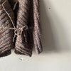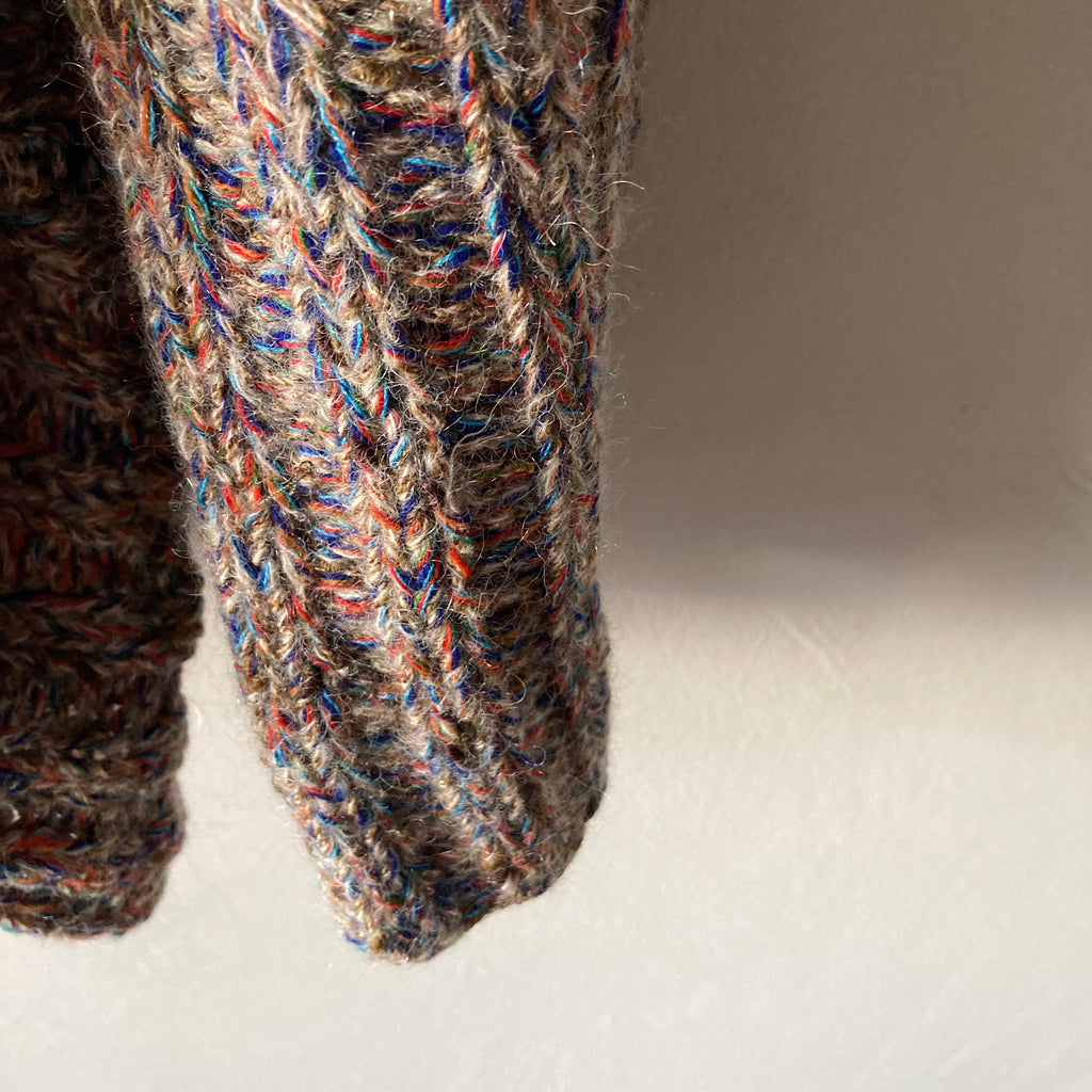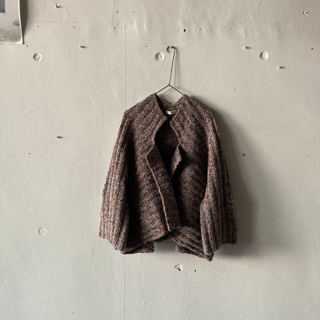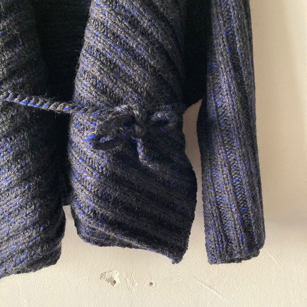 多本の糸で独特の色の表情を作るのがヒロミツヨシ独自の魅力を放つ真骨頂だと思っているのですが、こちらもひたすらにか・わ・い・い♡です。明るい多本取りのハンドニットは7本どり、ネイビーと黒のハンドニットは4本どりでどちらも甲乙付け難く、見れば見るほど唸ります。直線的なパターンでありながら身体が入ると絶妙に柔らかく沿います。ニットの特性をよく知るからこそ作ることができるのだなー素晴らしい。大人っぽくも、カジュアルにも着て欲しい1枚。紐は固定されていないので自由にお使いください。