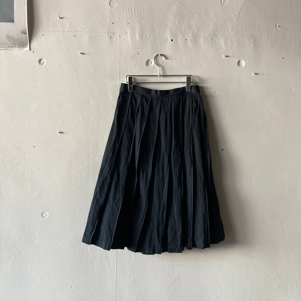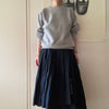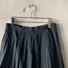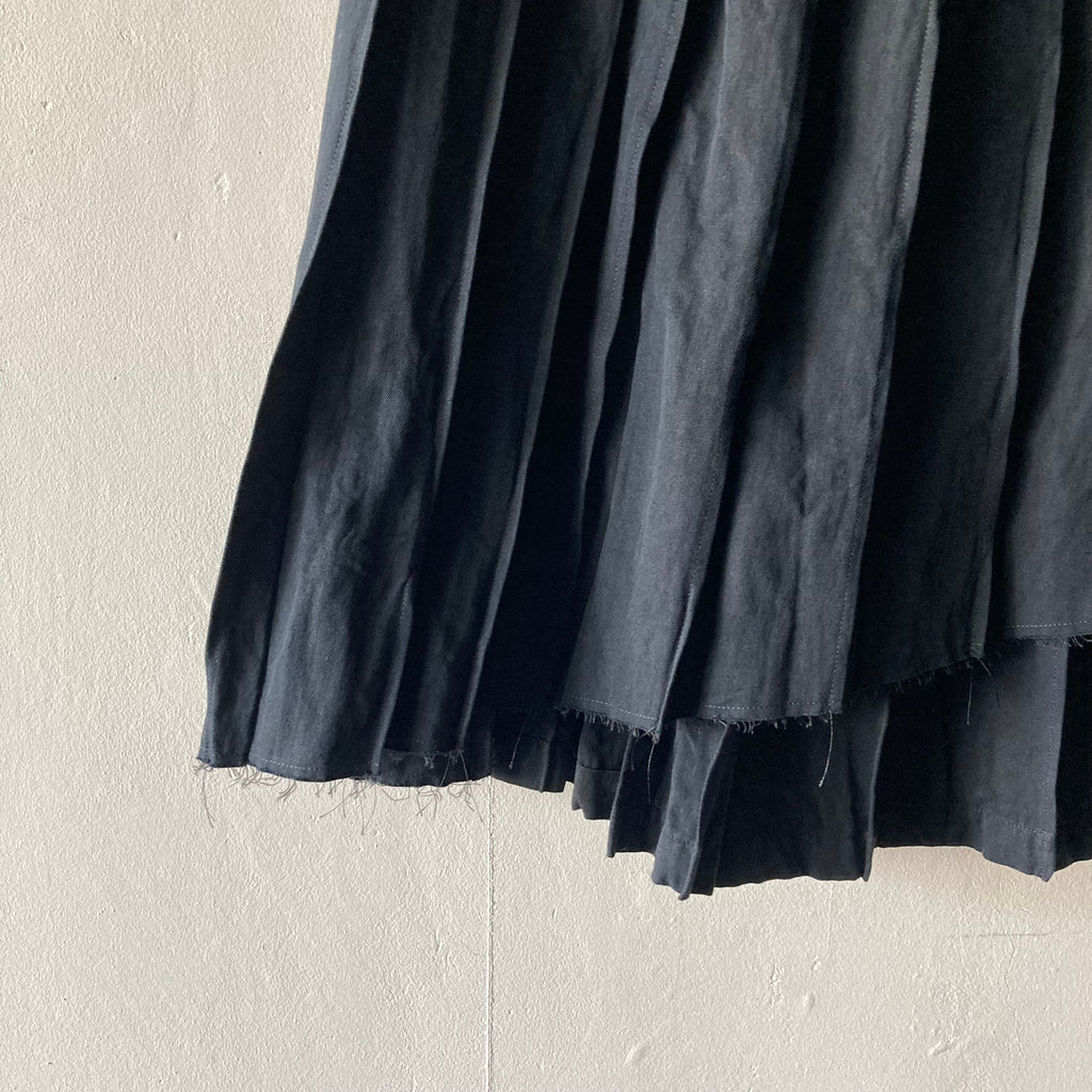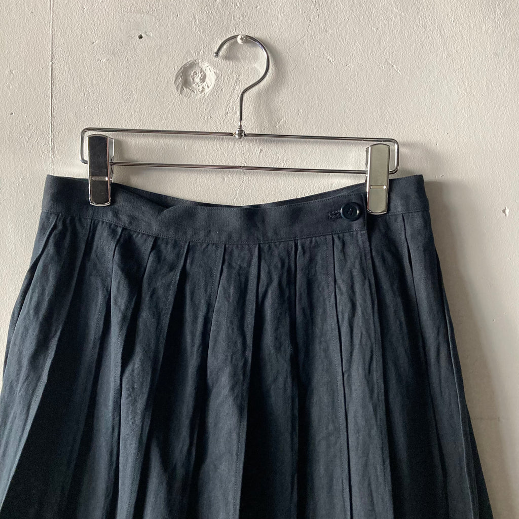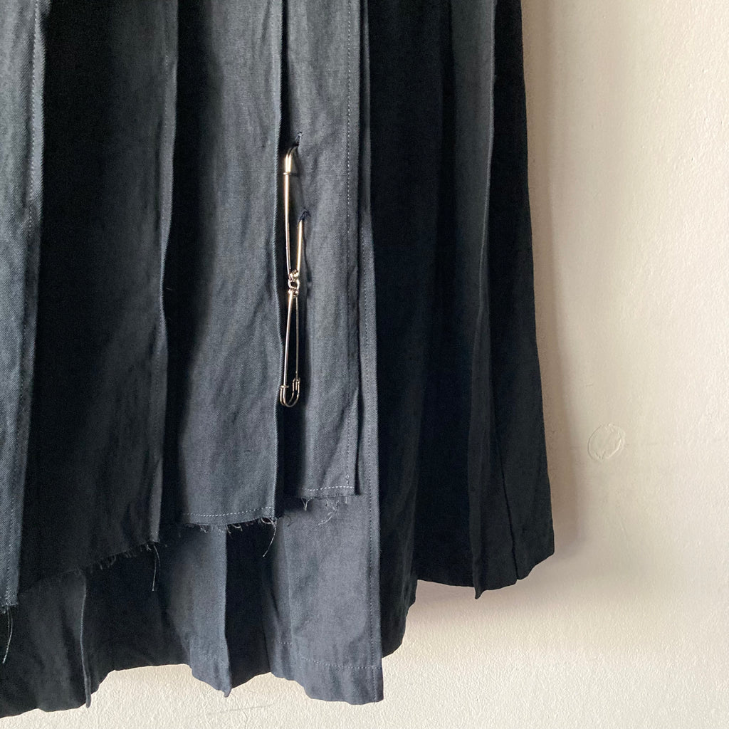 コットンリネンのラッププリーツスカートです。しっかりと厚みのある生地、前の斜め切りっぱなしが静かに主張するデザイン。今回は風が吹いてもきゃーとならないようにキルトピンが付属(2個くっ付いているところがいかにもかいさんらしい)しています。