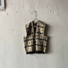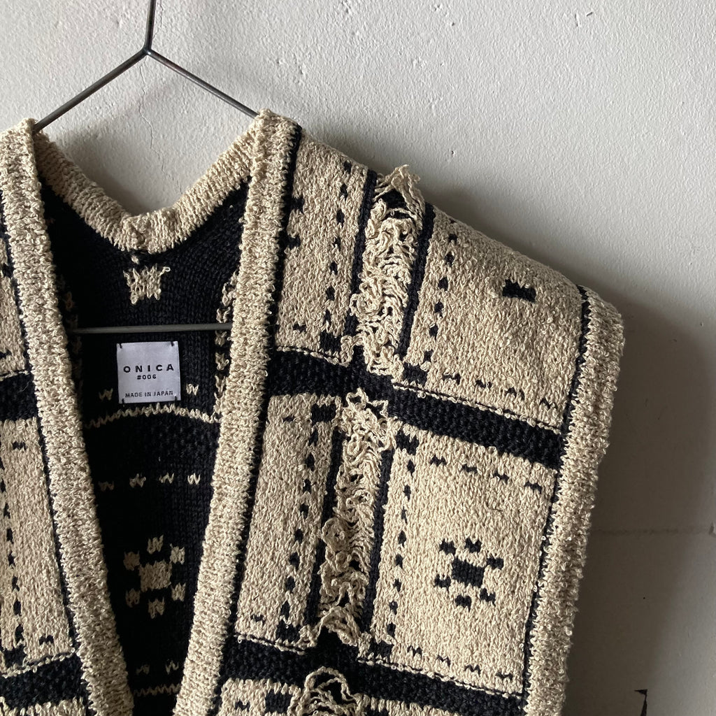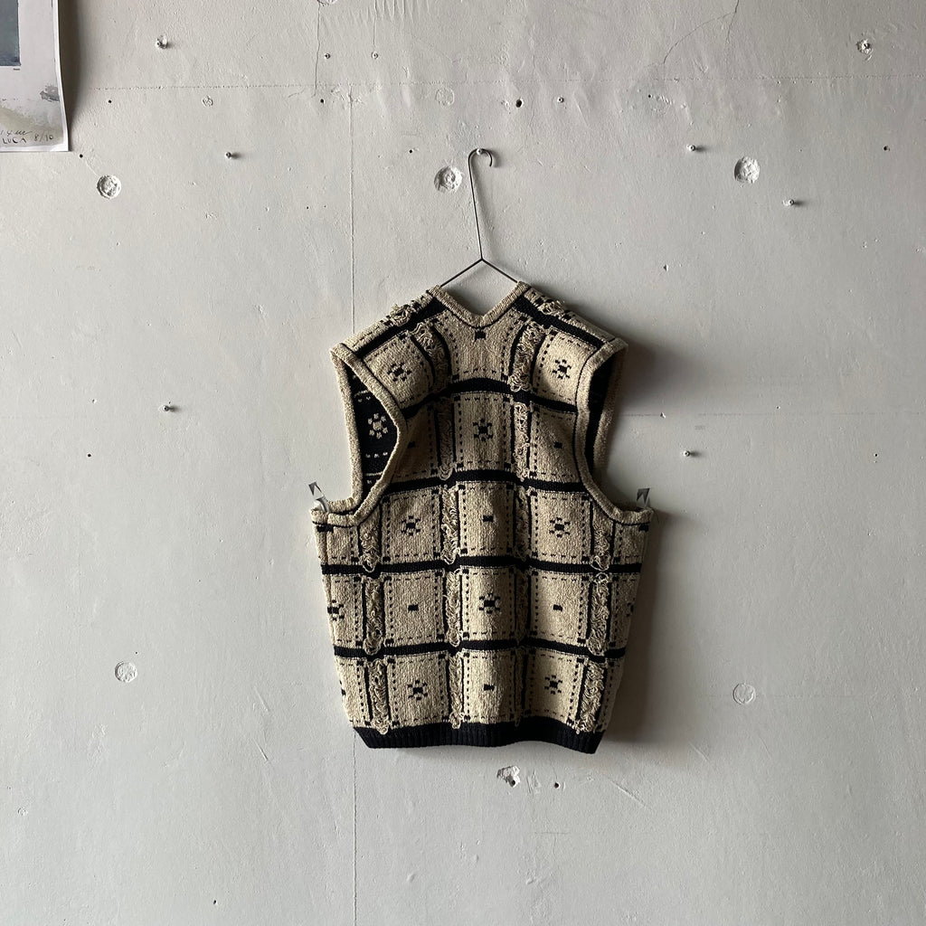 ウールとコットンでブロック柄を編み、繋ぎ合わせたニットベストです。季節の変わり目にワンピースやシャツ、カットソーの上からサッと羽織ってもよし、ジャケットよりも着丈がワンブロック分長いので着丈の短いものと重ねて柄を見せても。シャリ感のある素材と柄、陶製のトグルボタンも楽しんでください。
